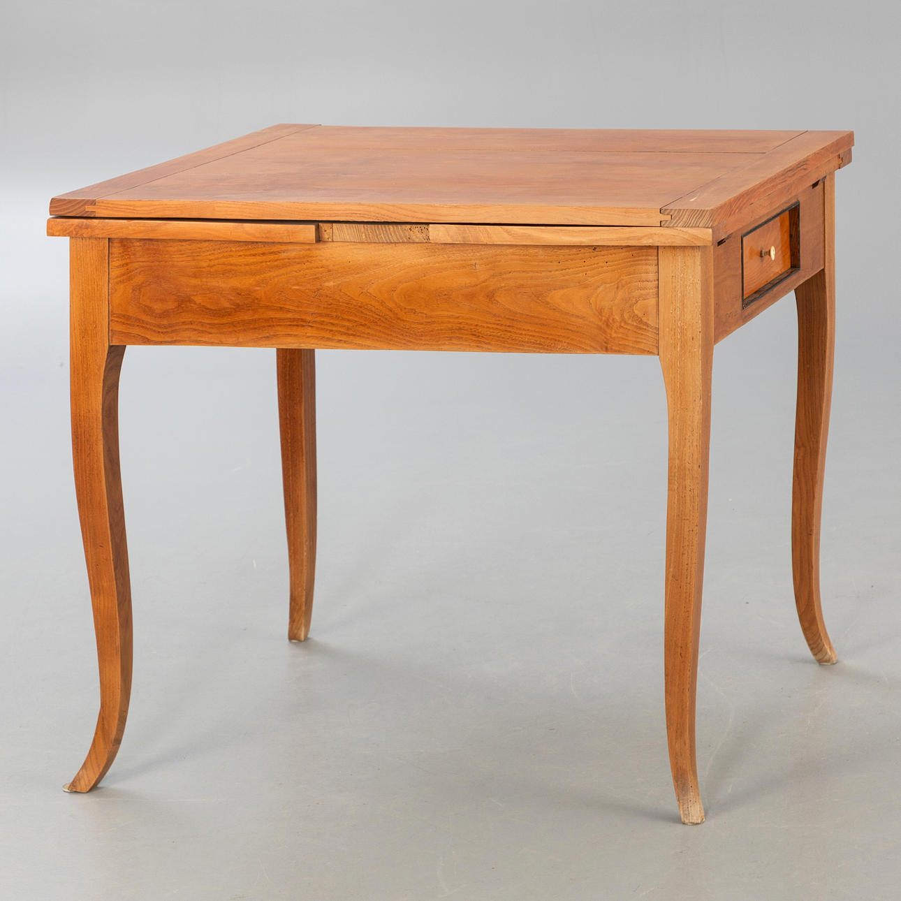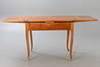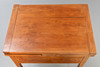 cherry. The wide frame on curved, slender square legs. A small drawer on a narrow side. The rectangular table top made of individual boards arranged in parallel. HxWxD: approx. 77 x 92 x 70 cm. L.: total approx. 168 cm.