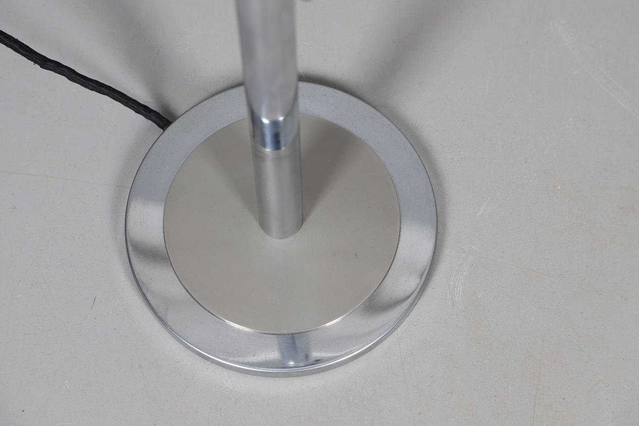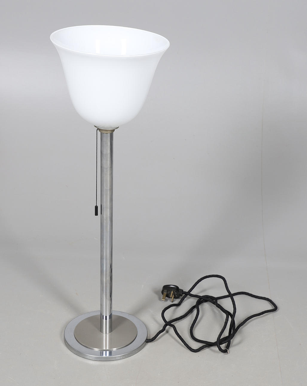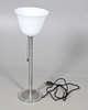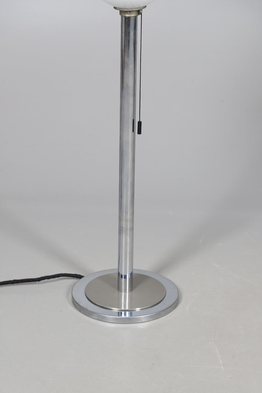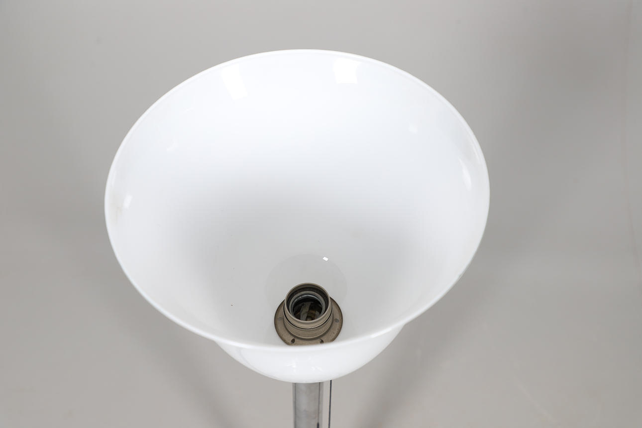 A large uplighter table lamp, with an opaline glass shade supported on a chrome stem and circular base. Designed by Walter Schnepel for Technolumen, and with labels to the base. 77cms high
