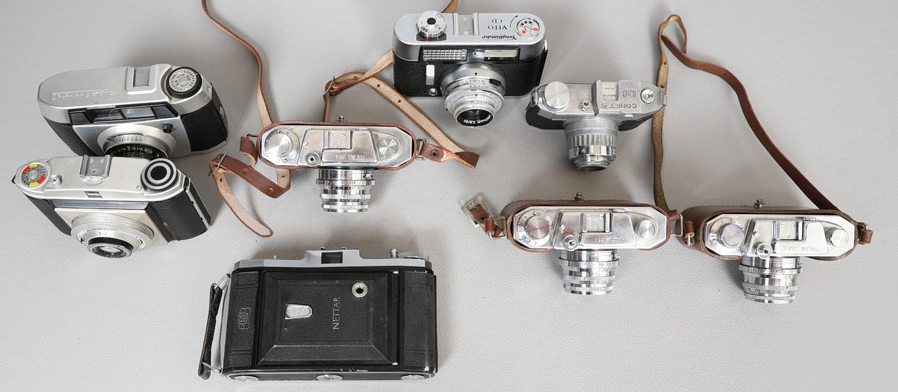 To include a Voigtlander Vito CD, Zeiss Ikon 518/2 Nettar, C.M.E Comet S, three Halina 35X cameras, Balda Baldinette and Baldinette II. (8).