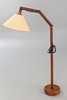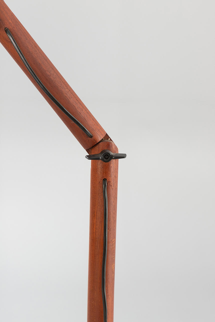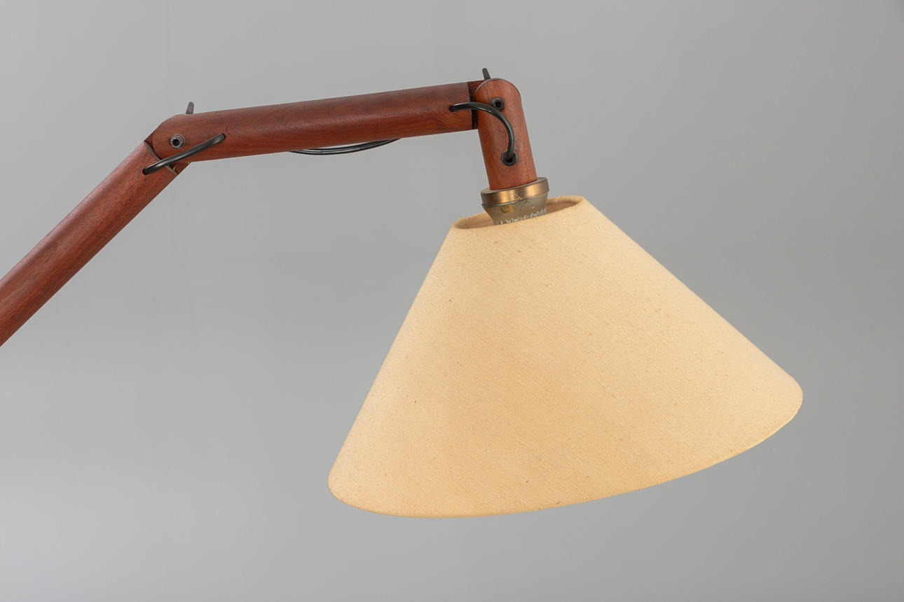 Teak wood, beige fabric lampshade. Multi-adjustable arm