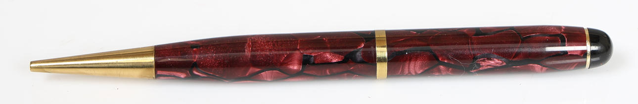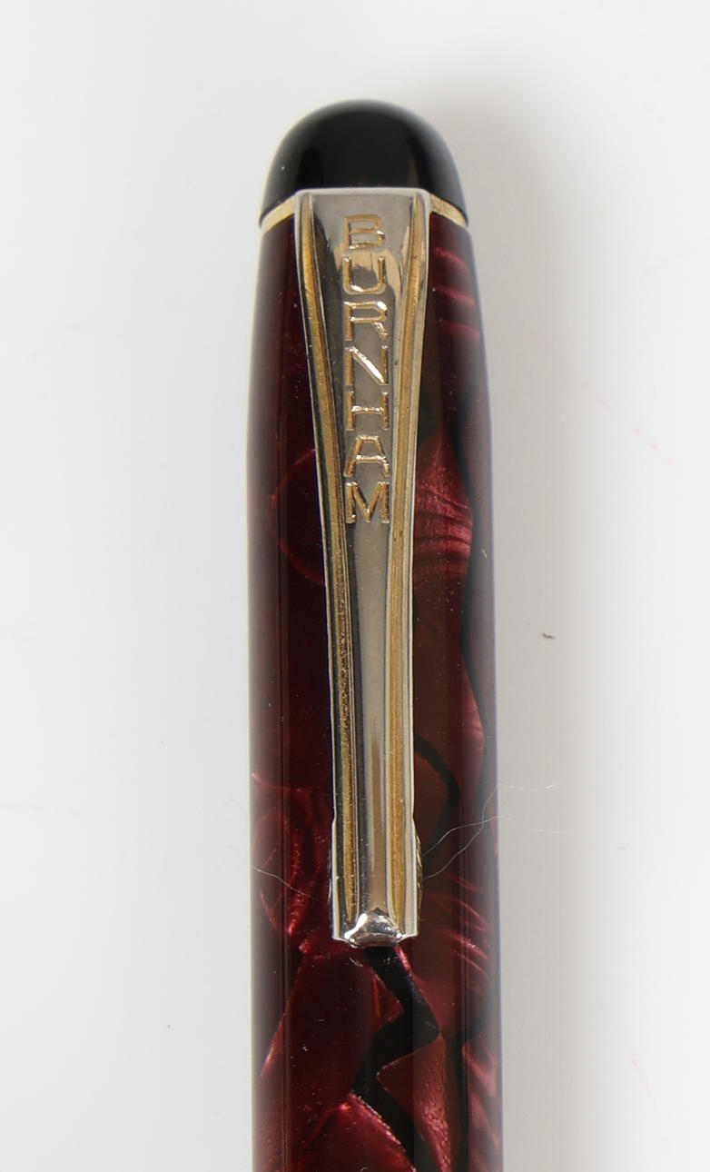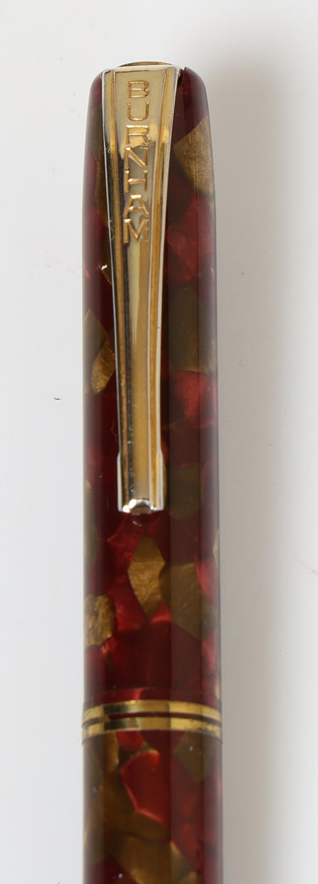 The first with a burgundy and bronze barrel, gold filled trim, the pocket clip reading 'Burnham', two band to the body, 12cm long, the second with pink and black marbled barrel, gold filled trim, a propel/repel example, 11.5cm long (2).