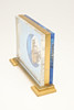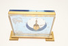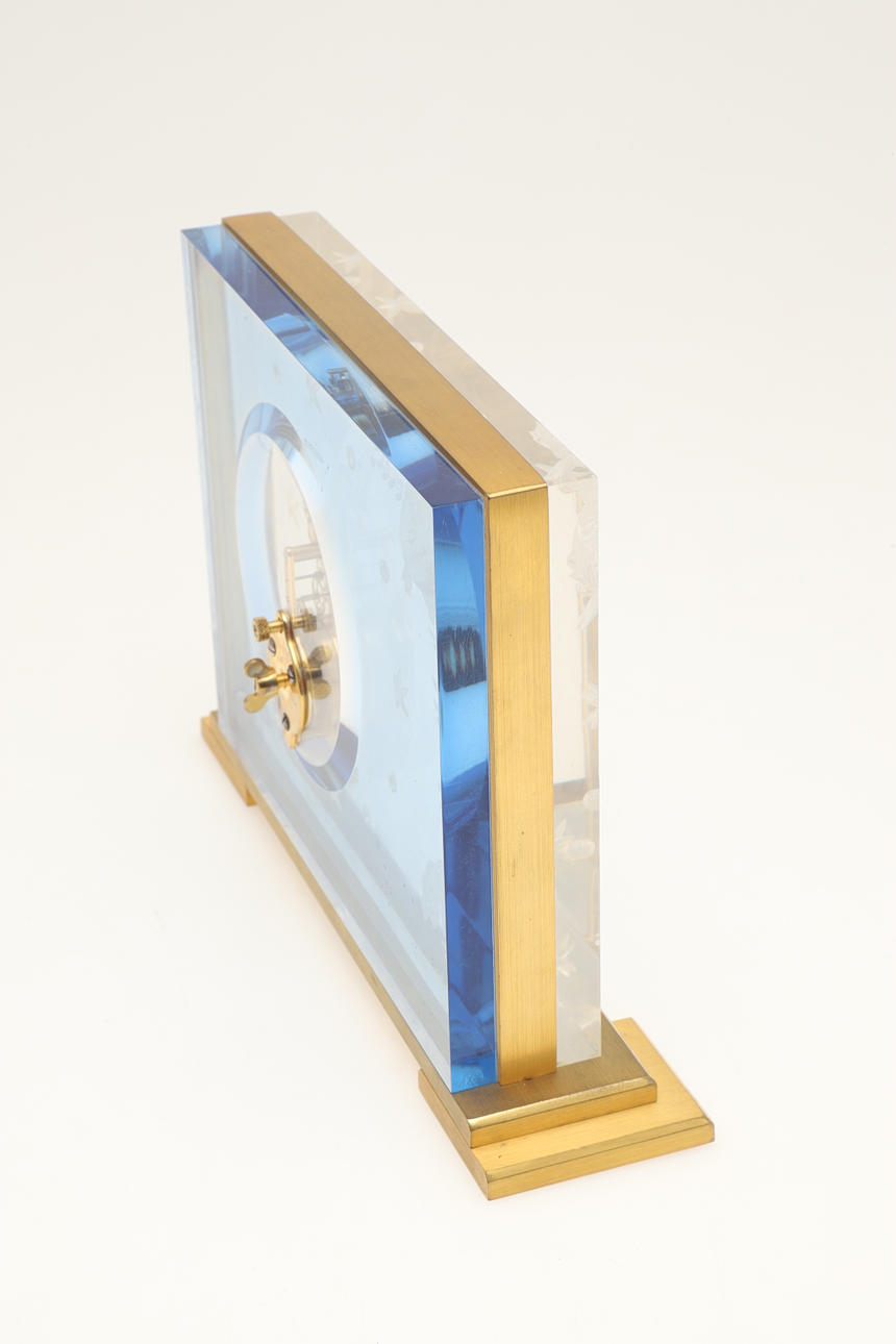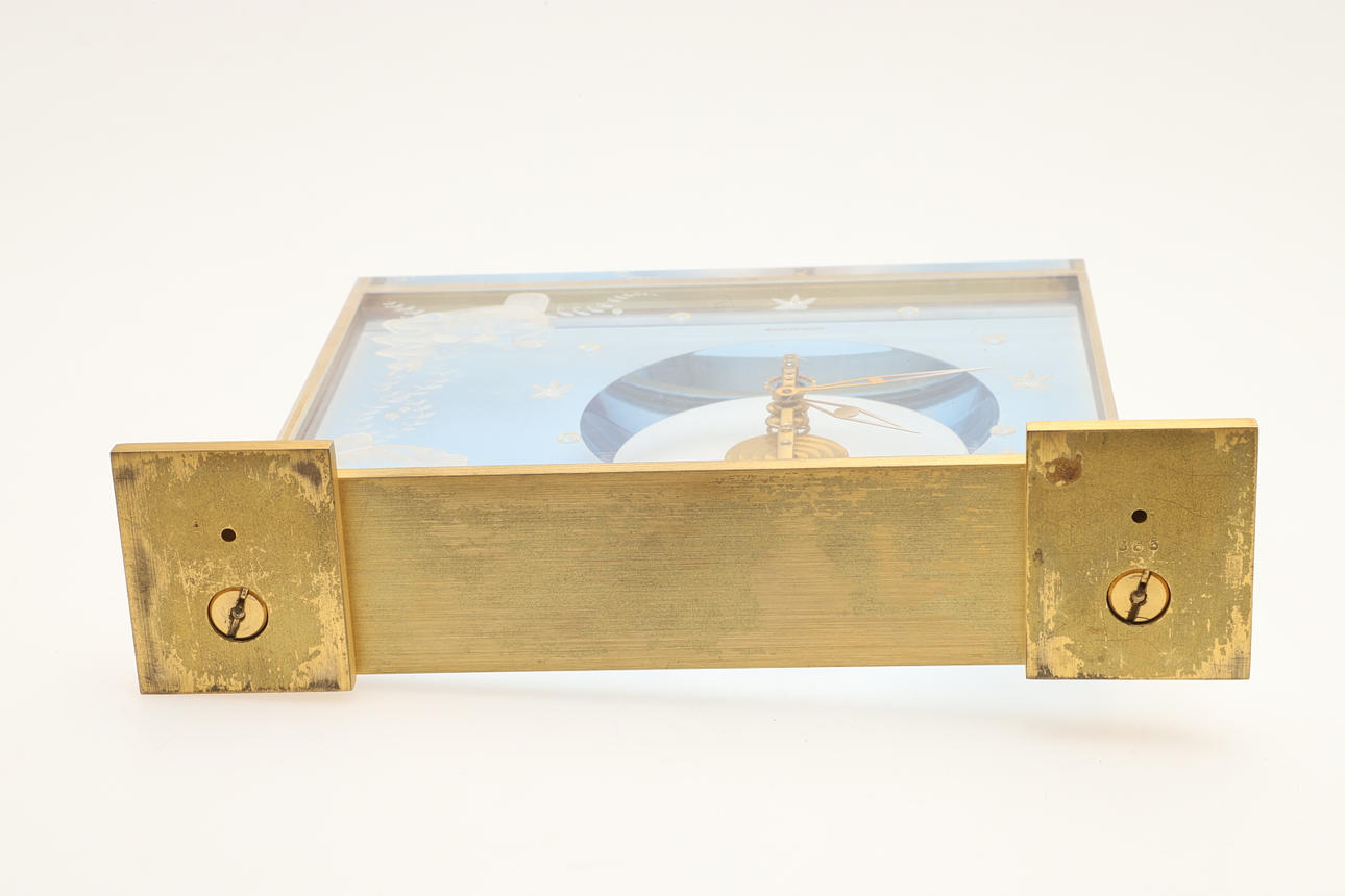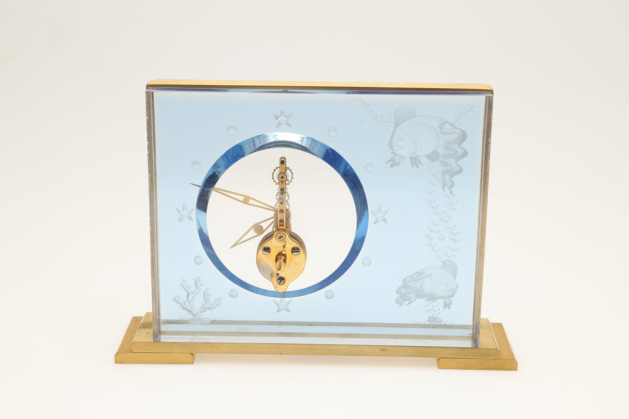 A lucite and gilt brass mantle clock, designed with fish and aquatic plants and supported on a brass plinth and feet and in a fitted case. Stamped '365' to the base. 16cms high, 18.5cms across, 22.5cms across including the feet, box 24.5cms by 18.5cms.