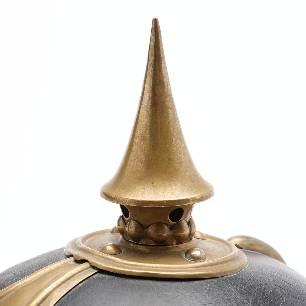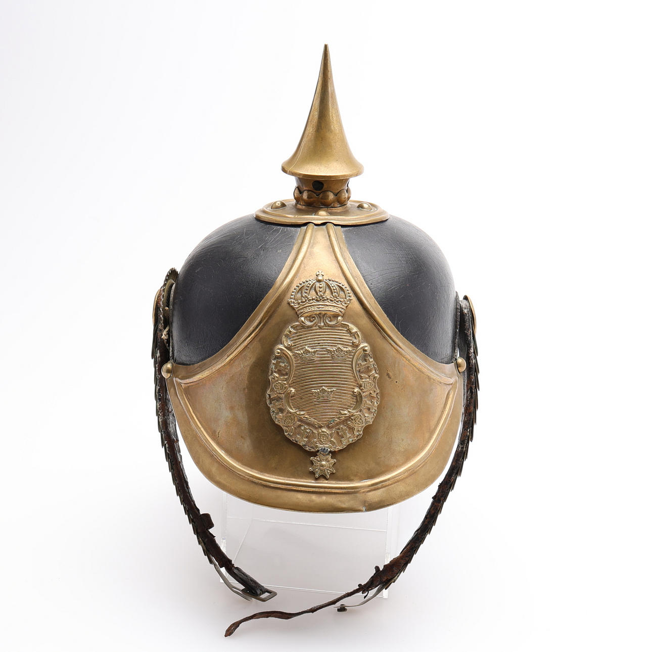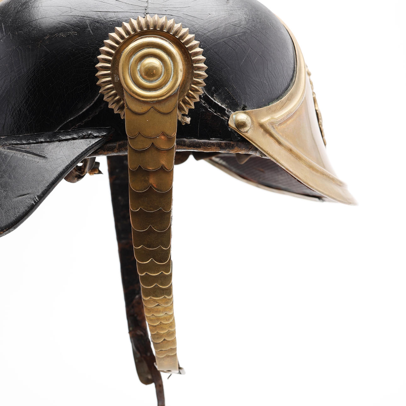 Black lacquered leather and brass.