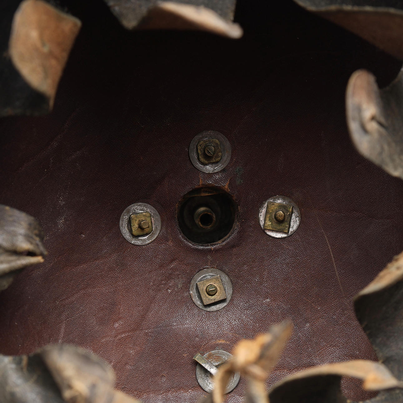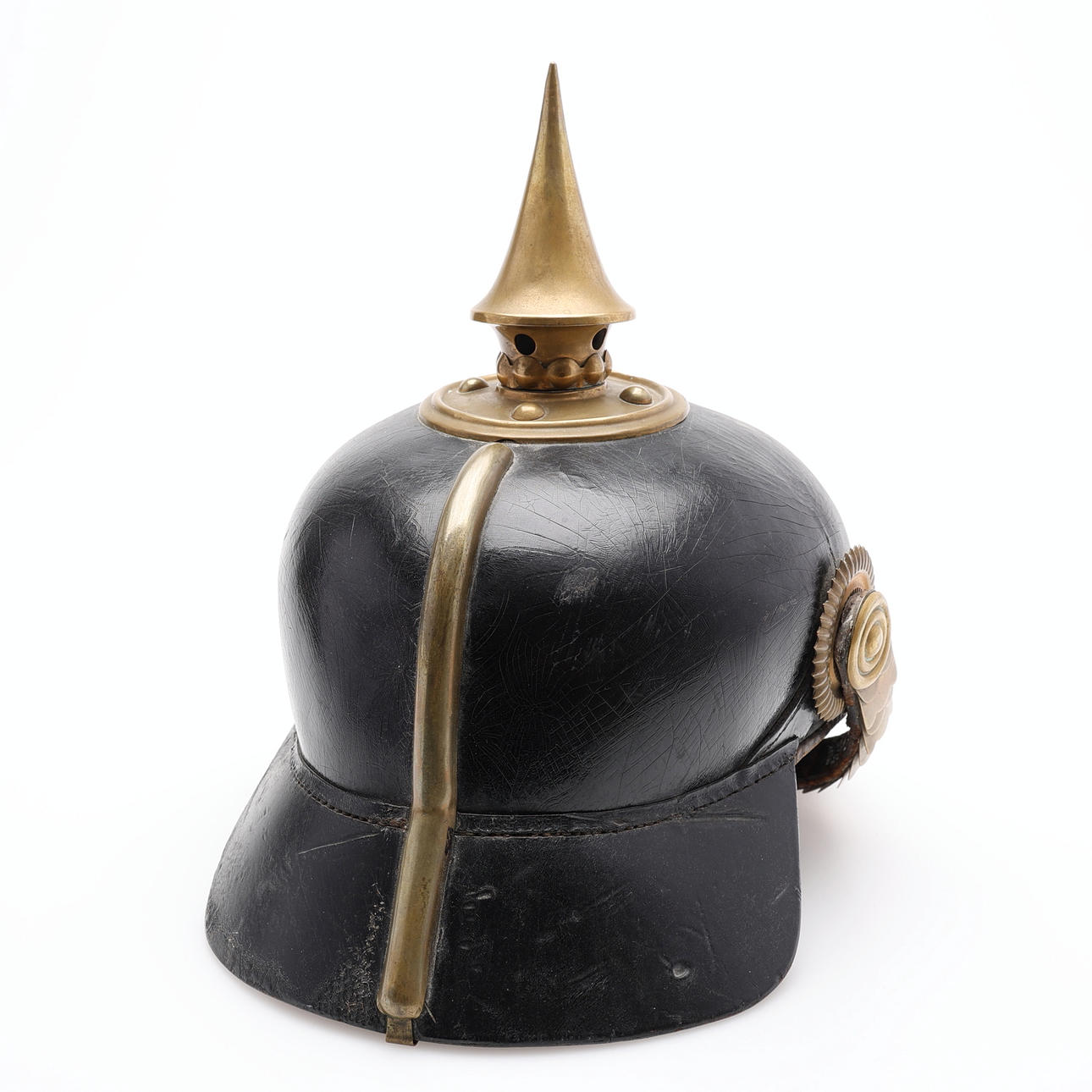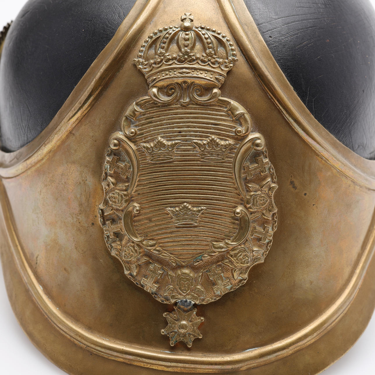 Black lacquered leather and brass.