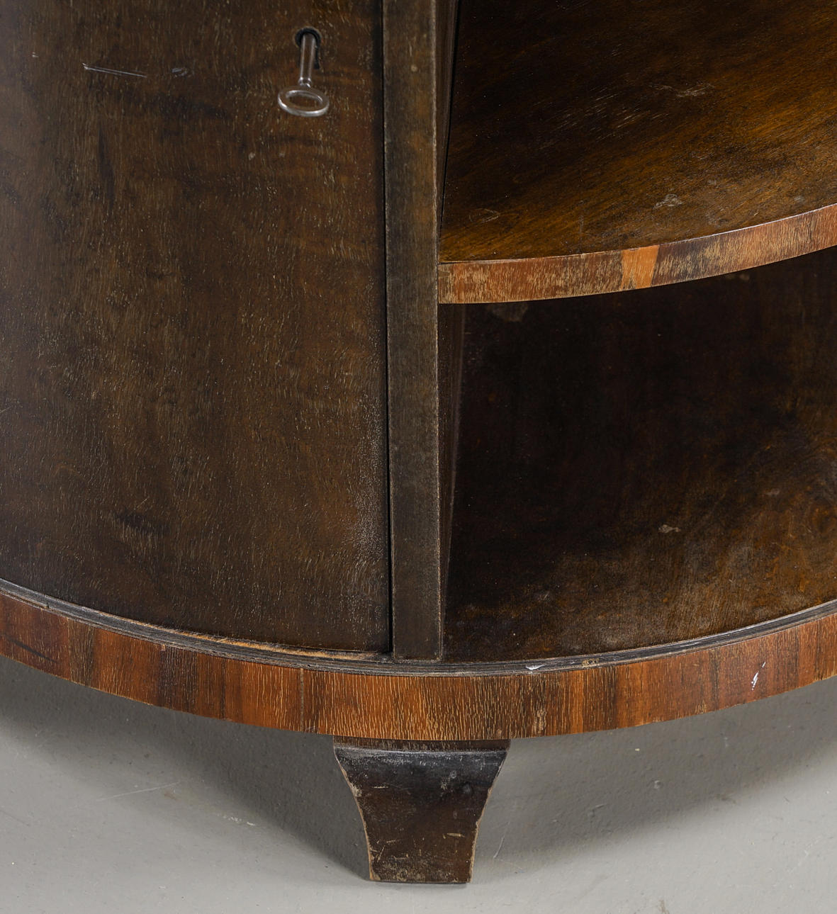 Veneered with birch and jacaranda, among others. Cabinet and drawer as well as shelves, plate with intarsia decor and glass top.