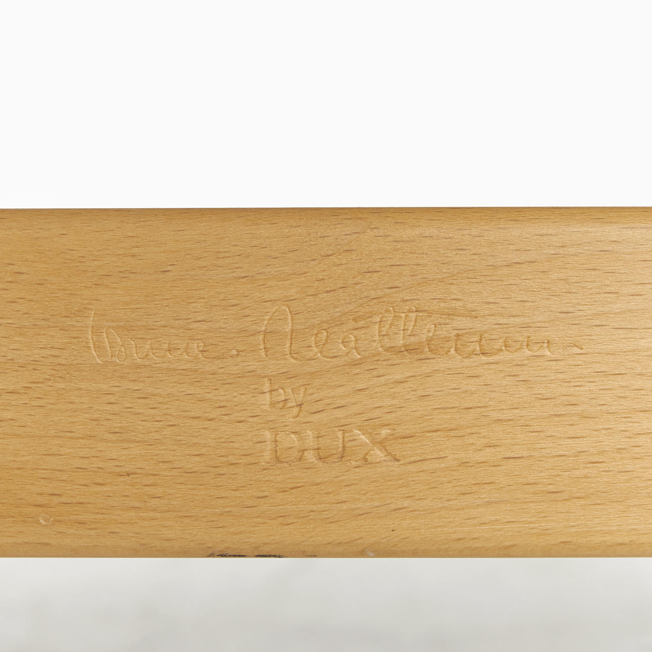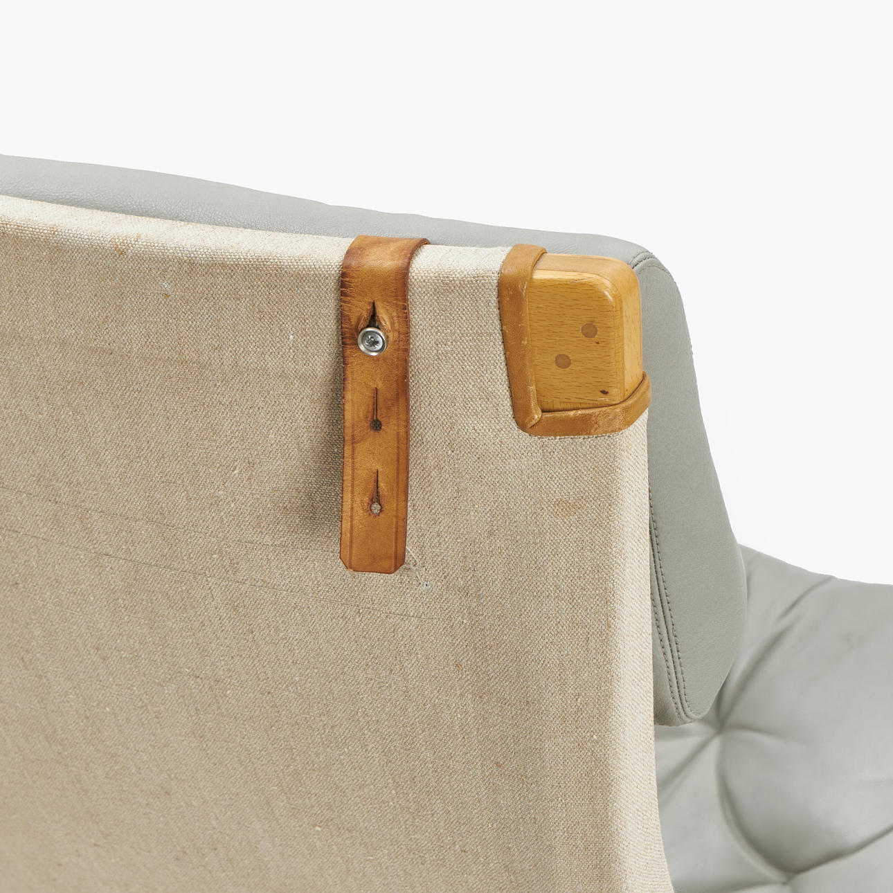 Grey leather upholstery, beech frame. Marked on sarg underneath.