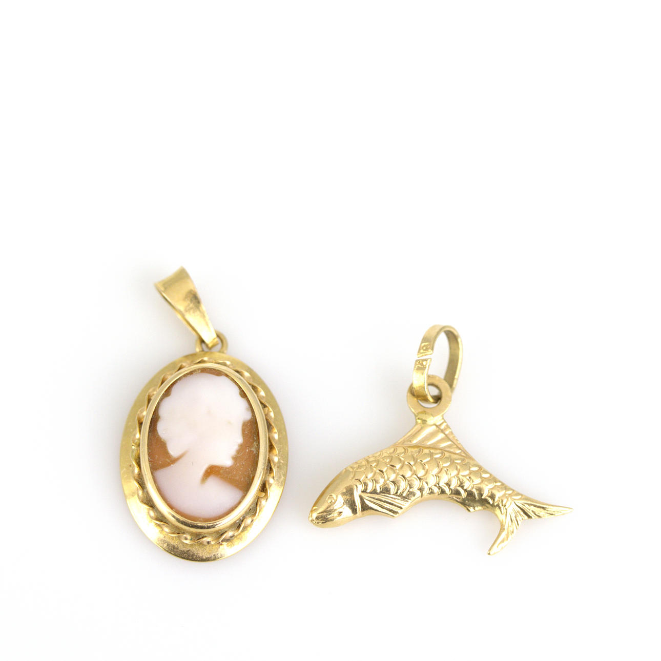 PENDANTS, 2 pcs. gold 18k, seashell camel and fish charm.
