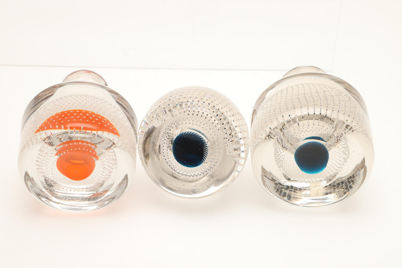 Various Whitefriars air bubble paperweights, including three with conical shaped handles (12.5cms, 12cms and 11.5cms high), with two other paperweights with a similar design (8.5cms and 8cms high, one with a box). (5).