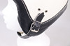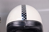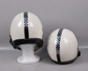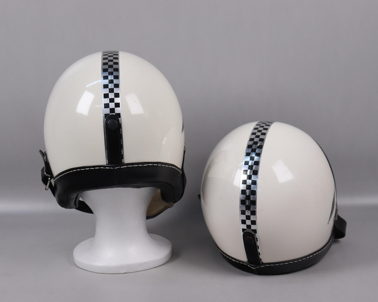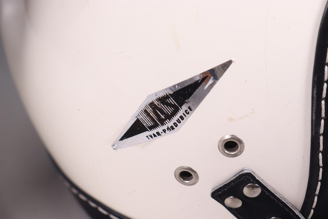 Marked Jas, Tvar-Pardubice, white plastic with black leather shoe lining and inner cover, chin strap upholstered with black leather.