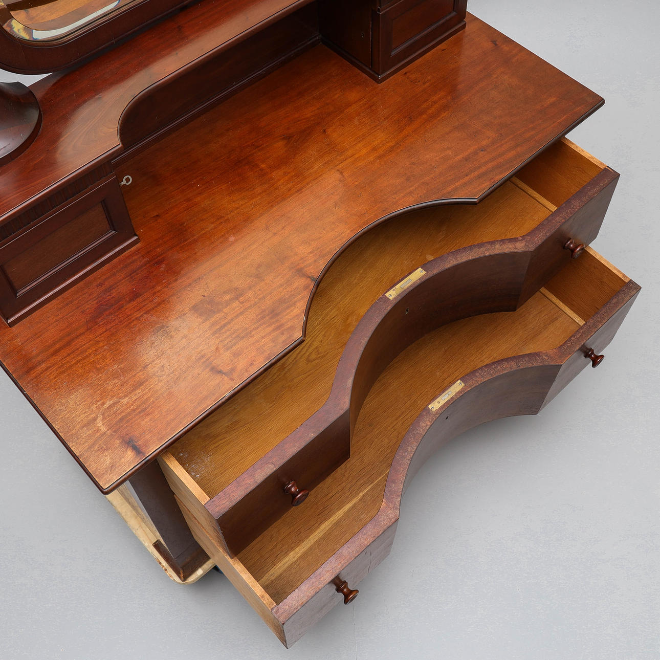 Condition of use, scratches, marks, stains. The key is missing for the chest of drawers, but there is a key for the upper compartments.