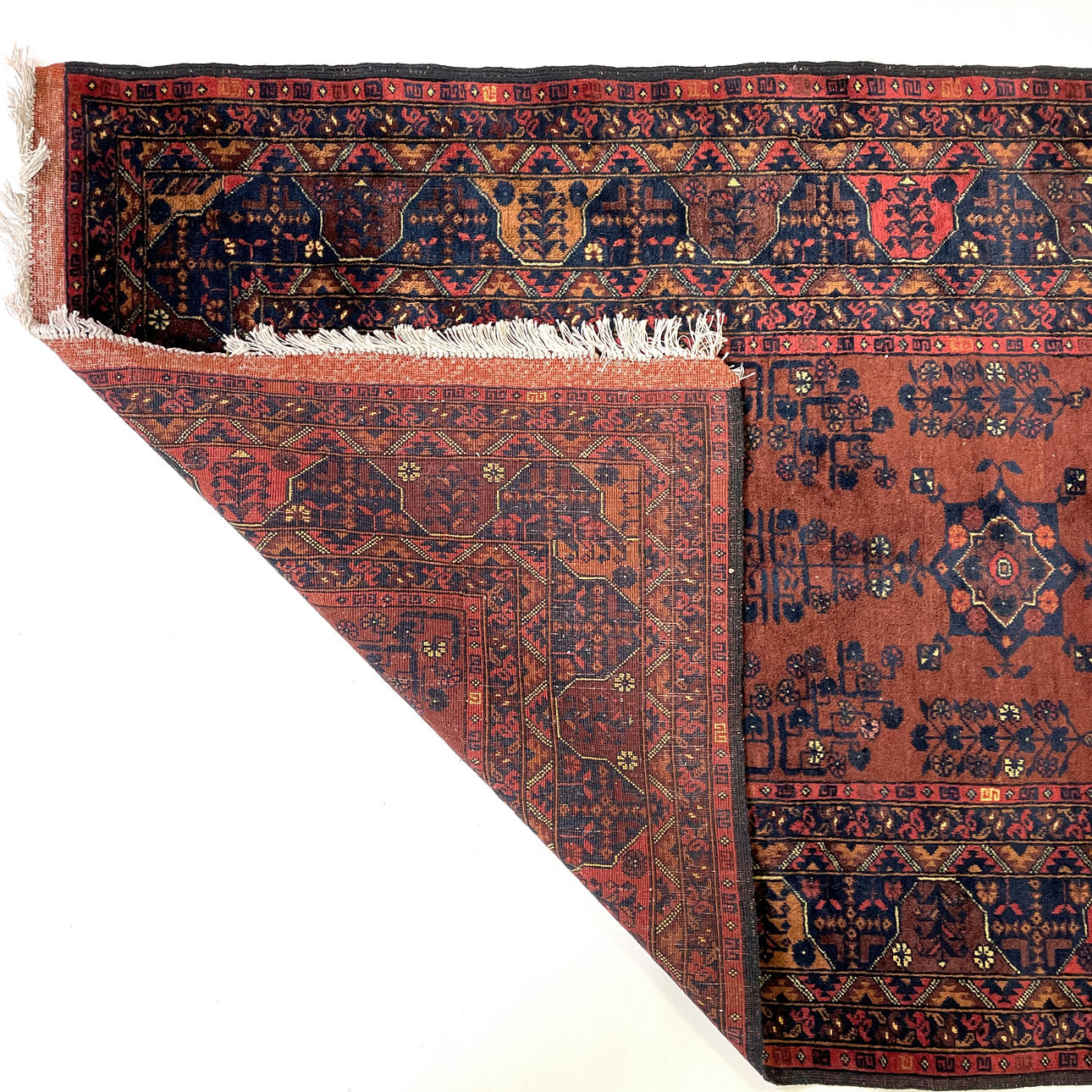 Oriental hand-knotted carpet, geometric pattern in polychrome colors against brown background. approx. 150 x 101 cm.