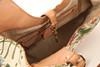 Handbag in textile with floral decor, leather details and gold-colored metal details.