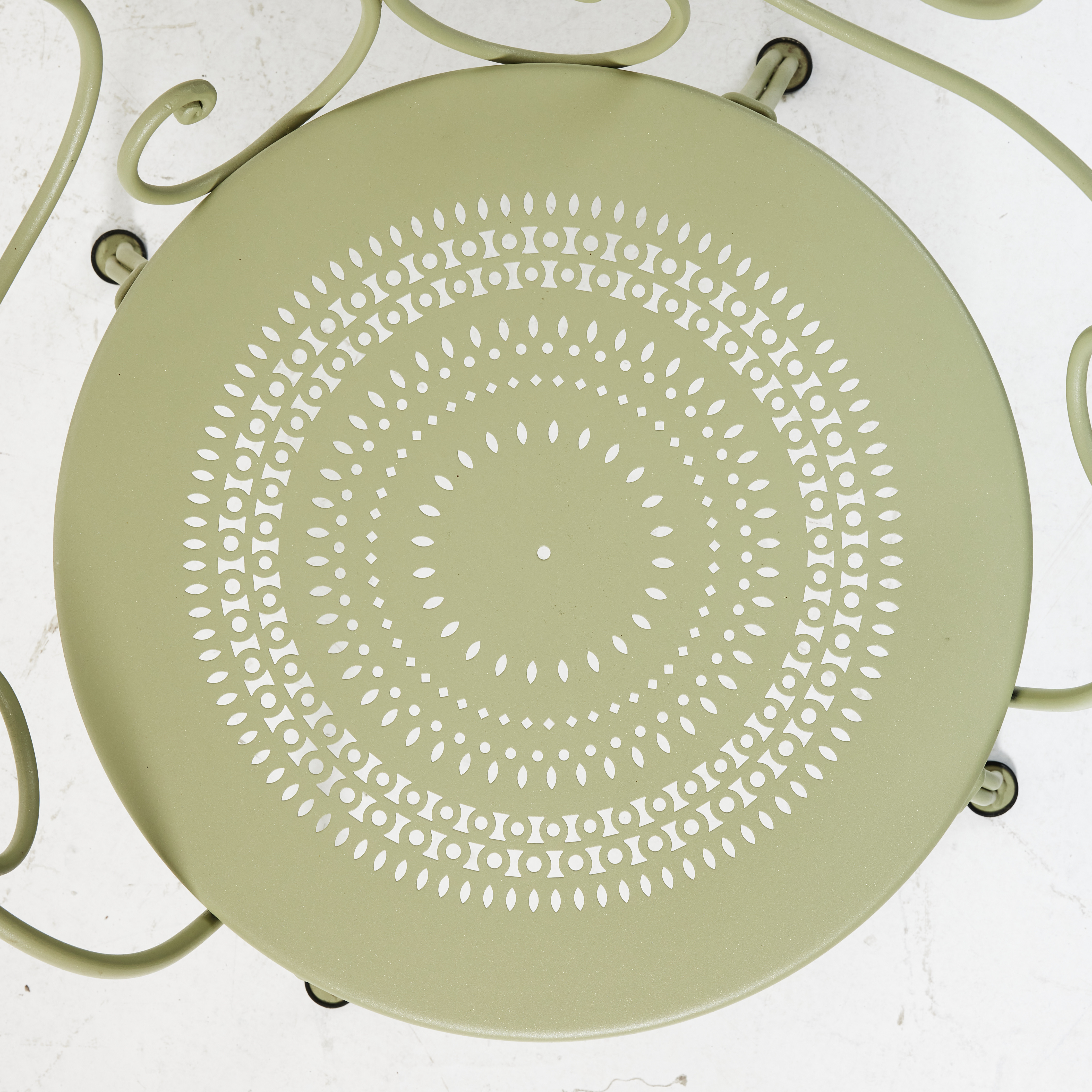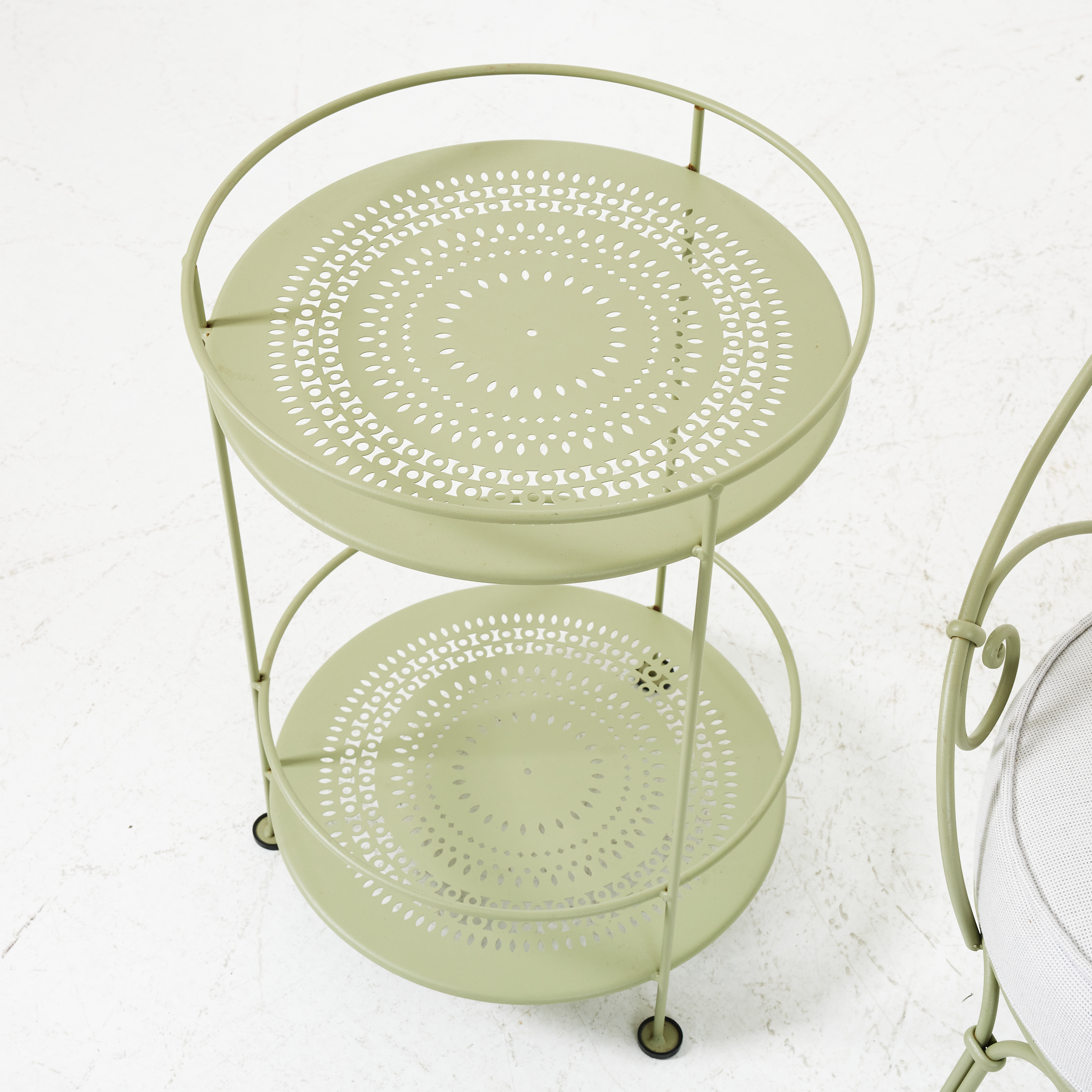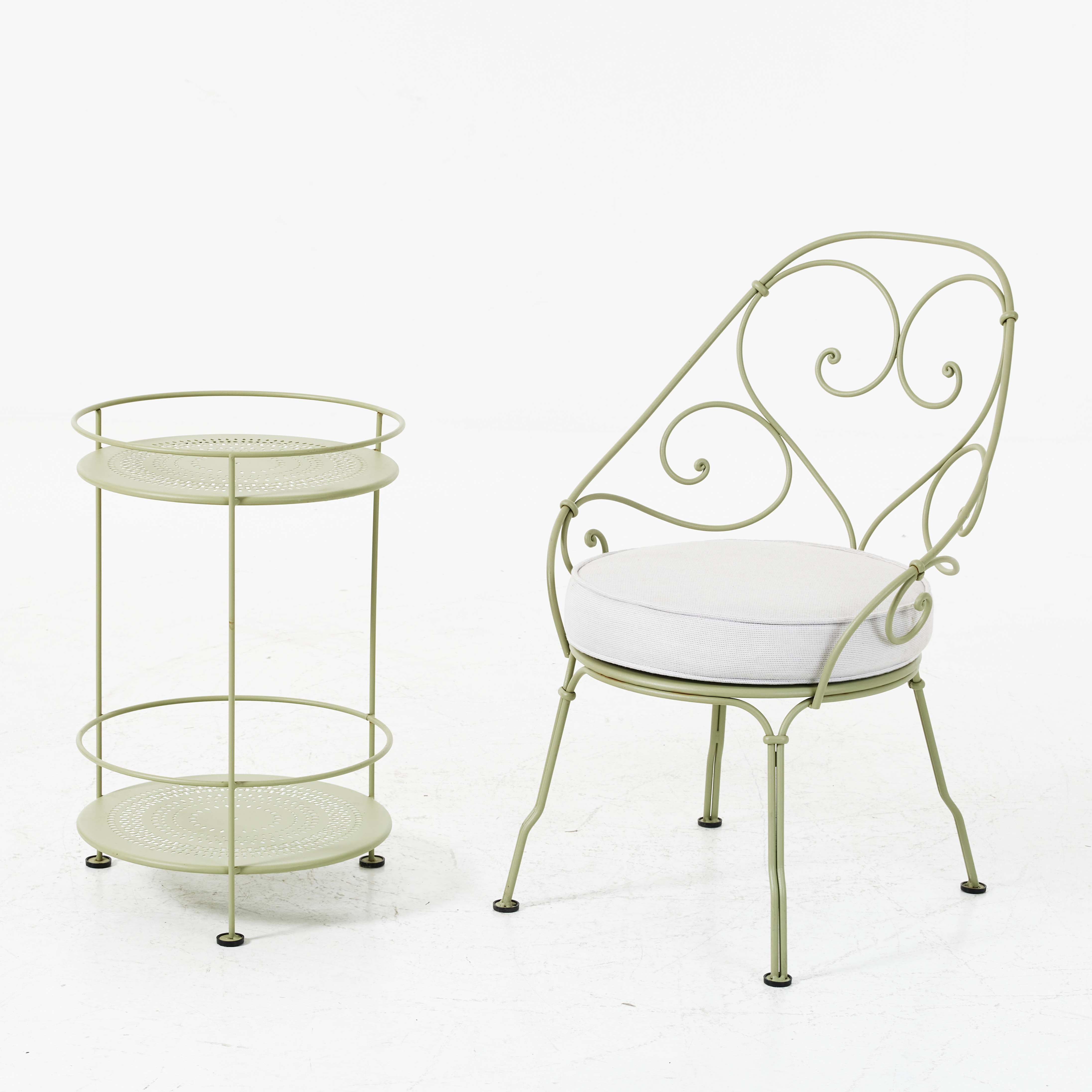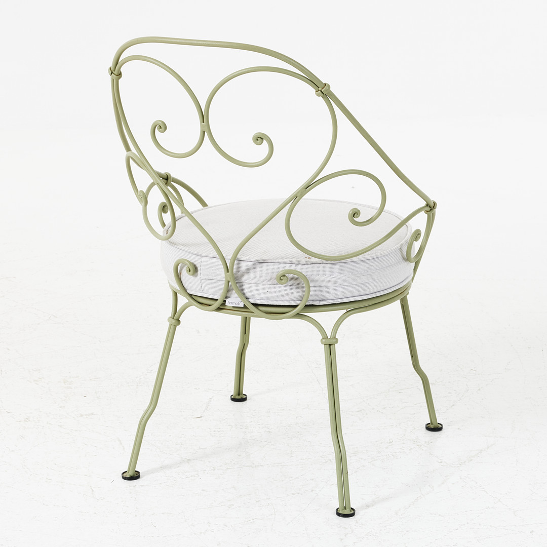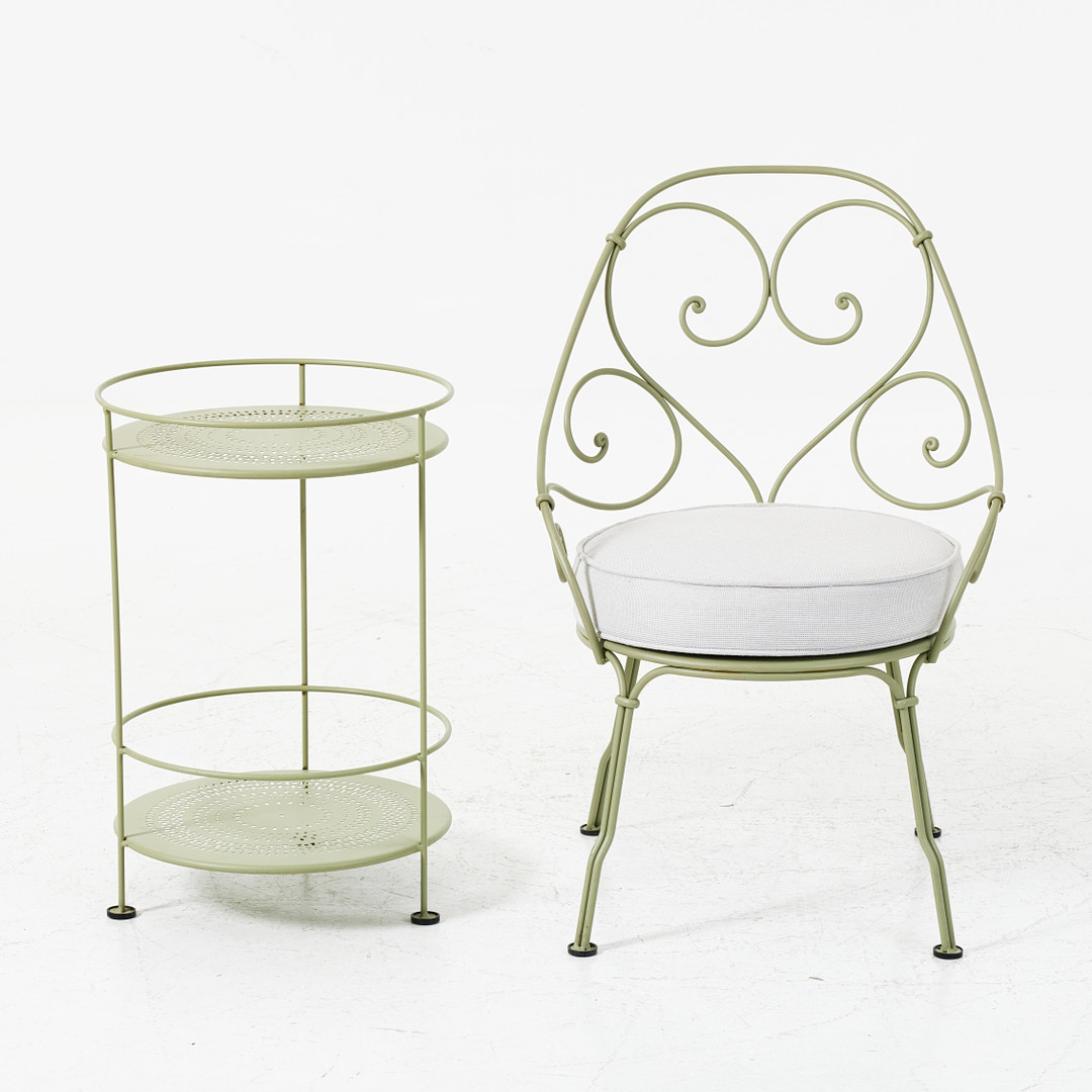 4286630. AN ARMCHAIR, TABLE, 2000's, FERMOB, green lacquered.
