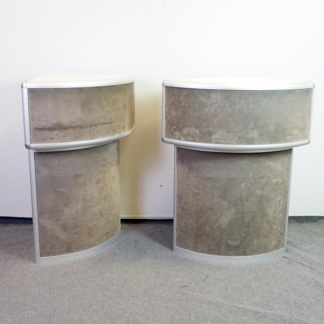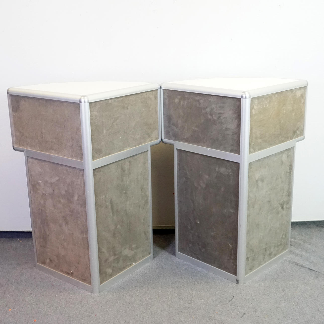 Rounded exhibition table/stand table, 2 pcs modules. Dressed in brown velor. Height 104 cm, width 60 cm, depth 60 cm.