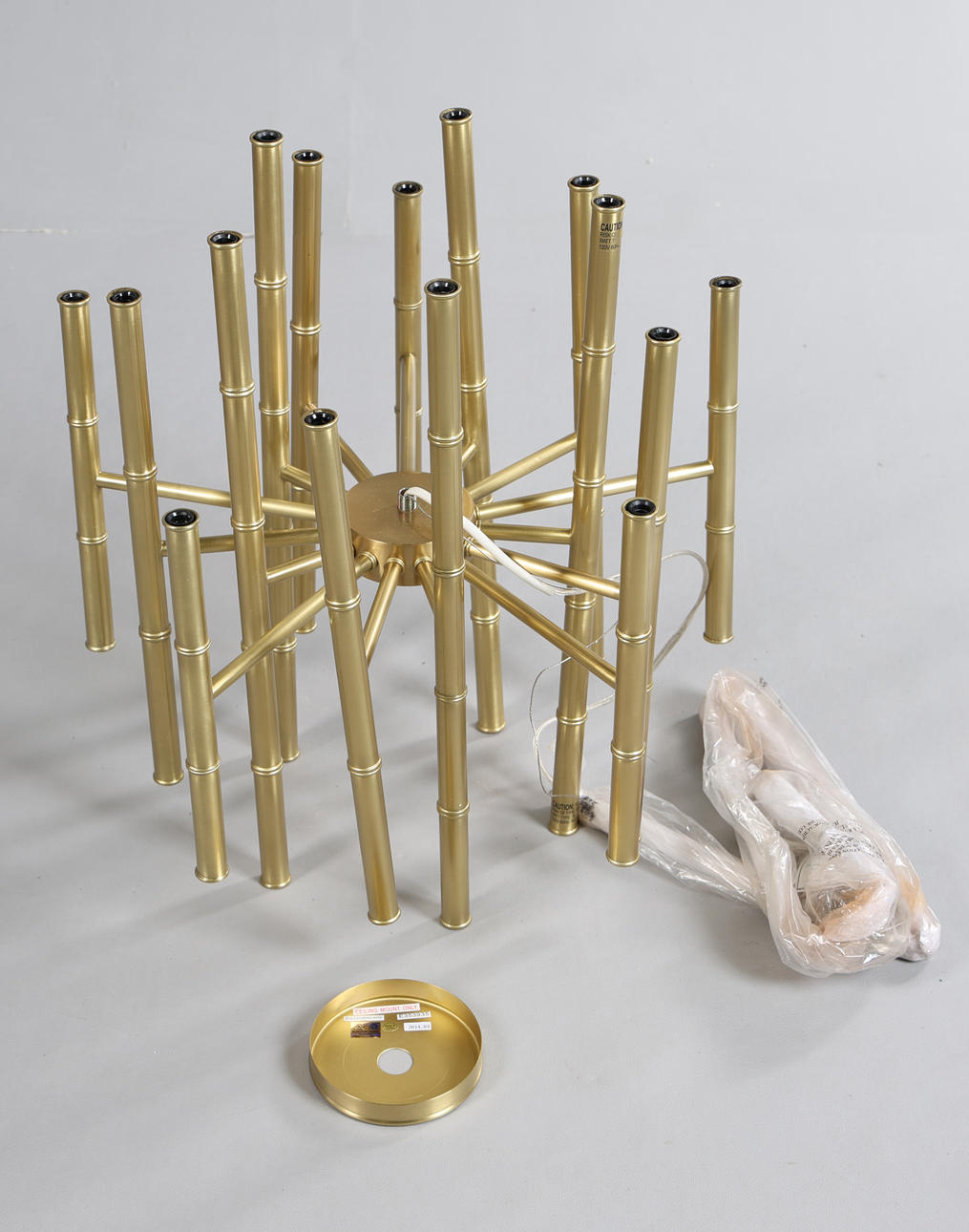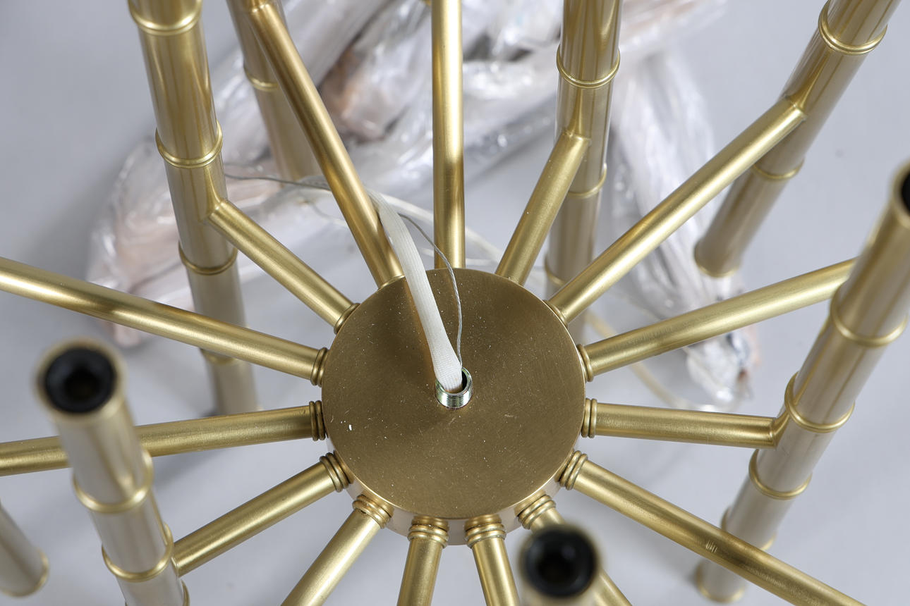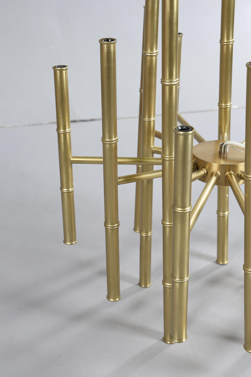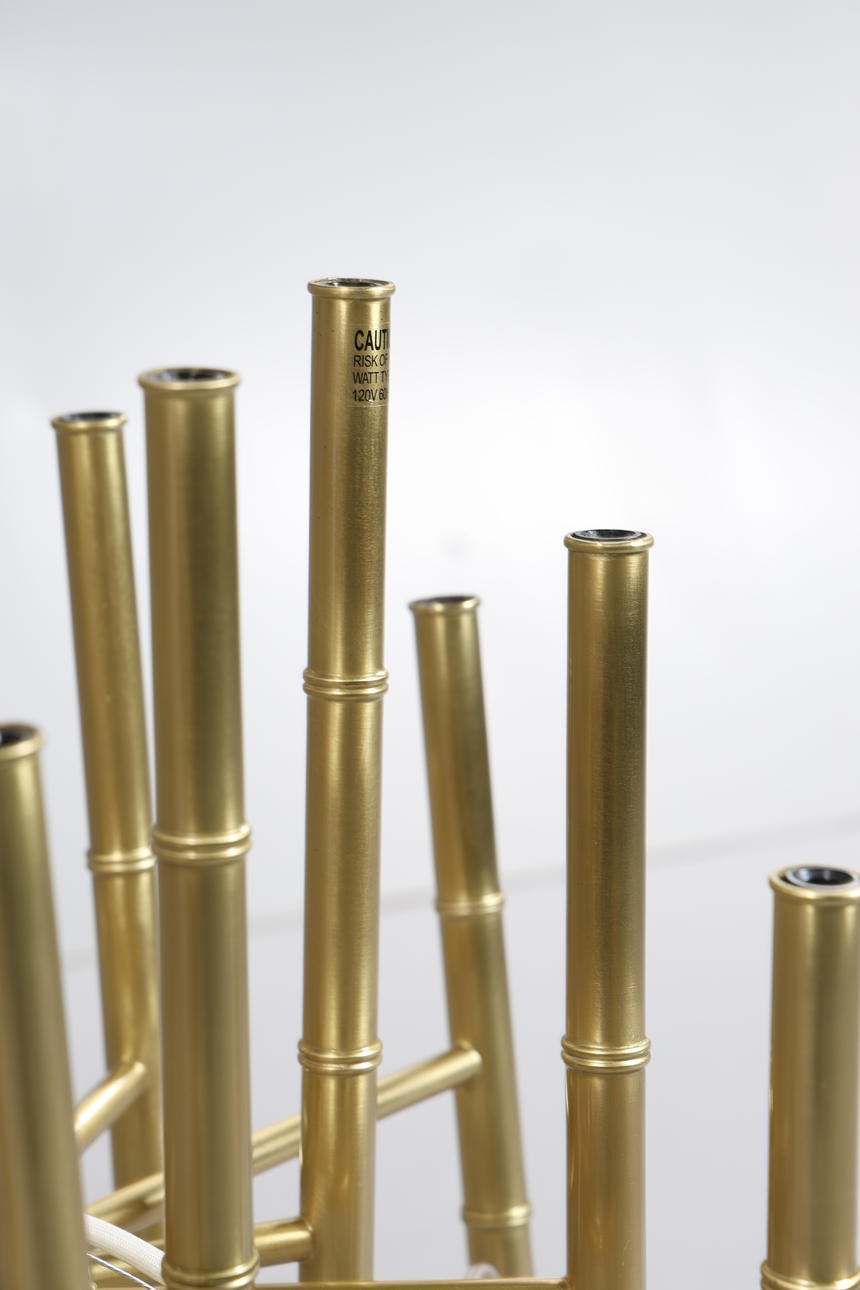 The 30 light chandelier by Jonathan Adler, with bamboo style brass arms, tallest arm measuring 55.5cm height, approx. 50cm diameter.