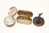 of circular form, the lid surmounted with applied clam shell, hallmarked Langfords Silver Galleries, London, 1997, 5.5cm diameter, together with another of rectangular form, cm long, 4.3ozt (2).