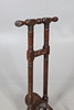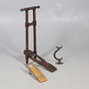 The boot jack with turned features (Length laid flat 81.5cm), together with a smaller boot jack puller and a cast iron item of interest, possibly Victorian. (3).