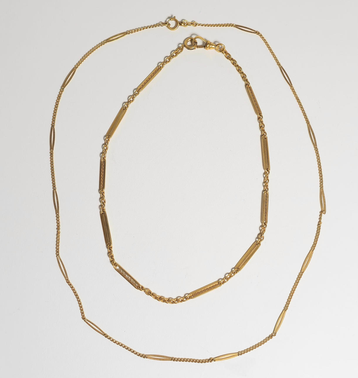 4291126. 2 ANTIQUE LEONTINA GOLD-PLATED WATCH CHAINS.