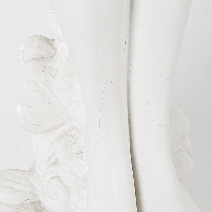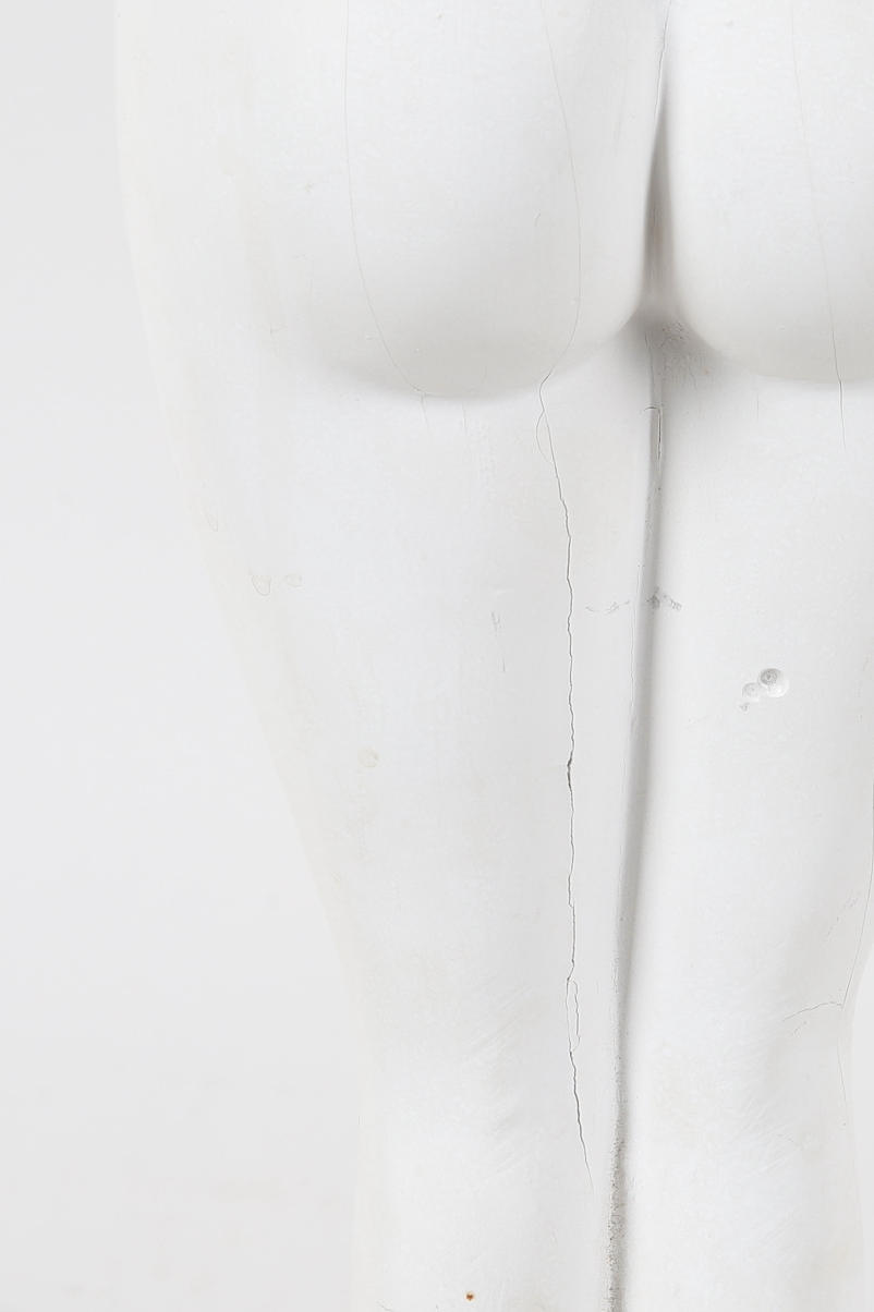 Normal wear and tear, some surface dirt, chips in the hem, marks on the back of the right thigh, cracking in the paint.