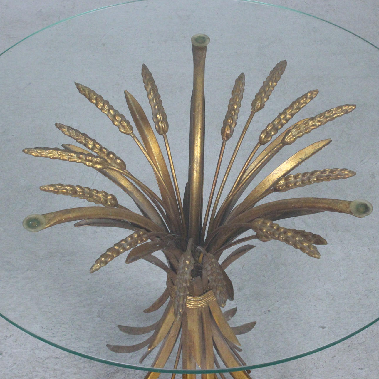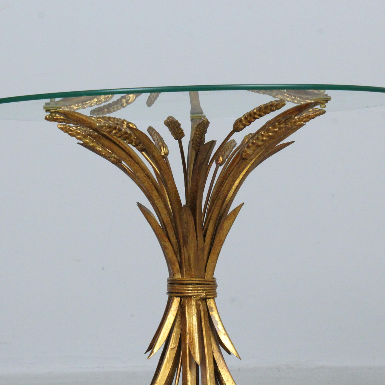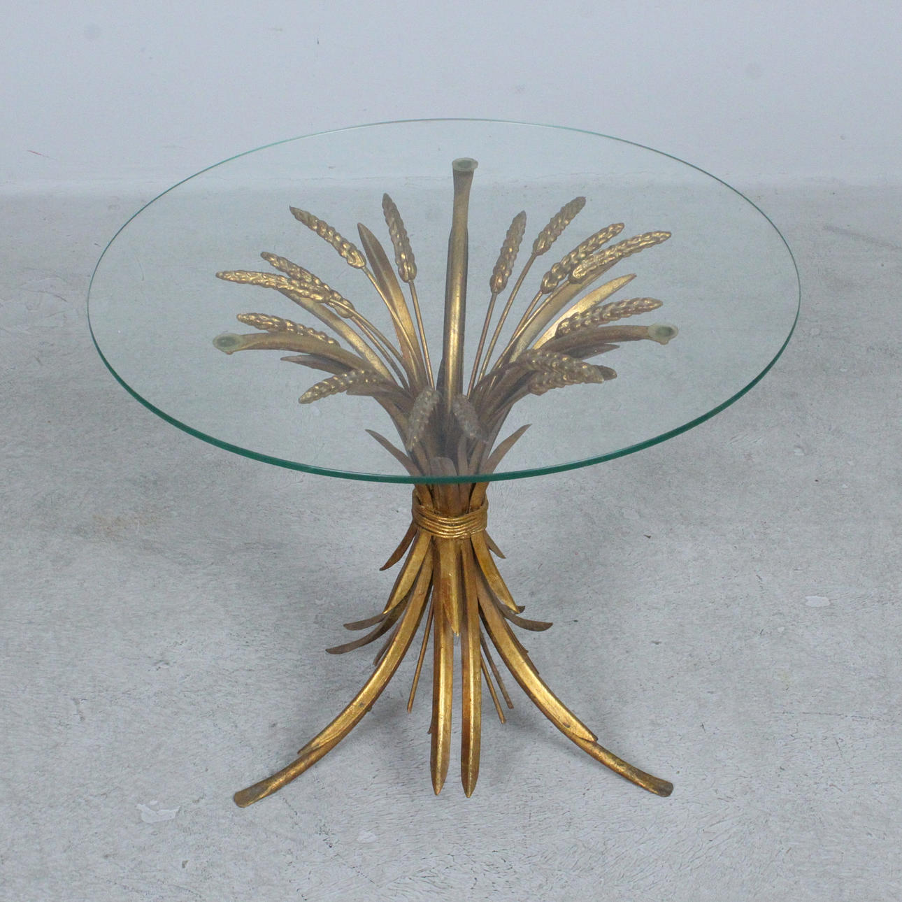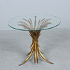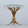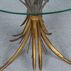 coffee table with a brass base with spiked gold leaf finish and a round glass table top,