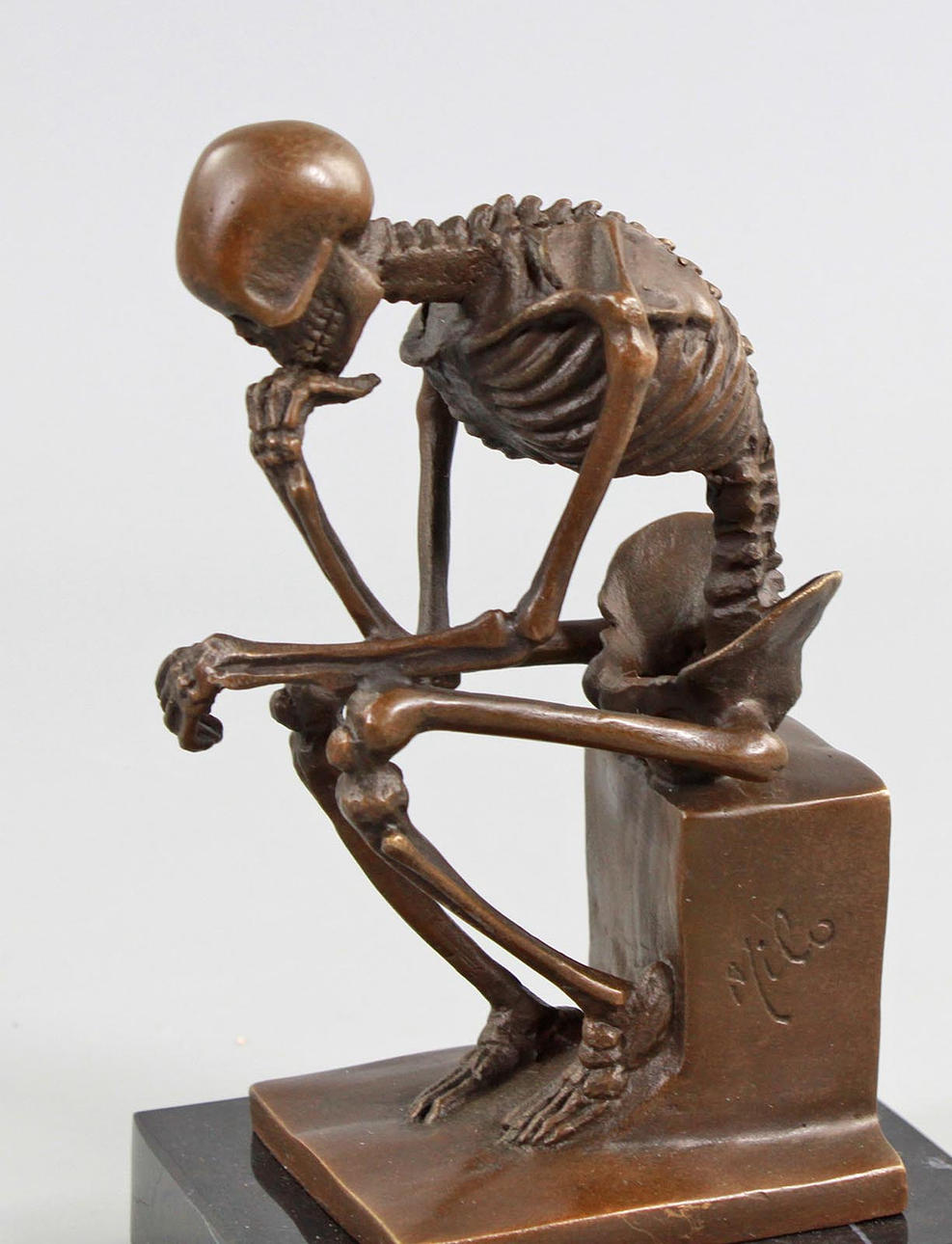 Bronze figure made in the form of a skeleton, standing on a marble base, marked Milo at the base, height 14 cm, base 8 x 8.5 cm.