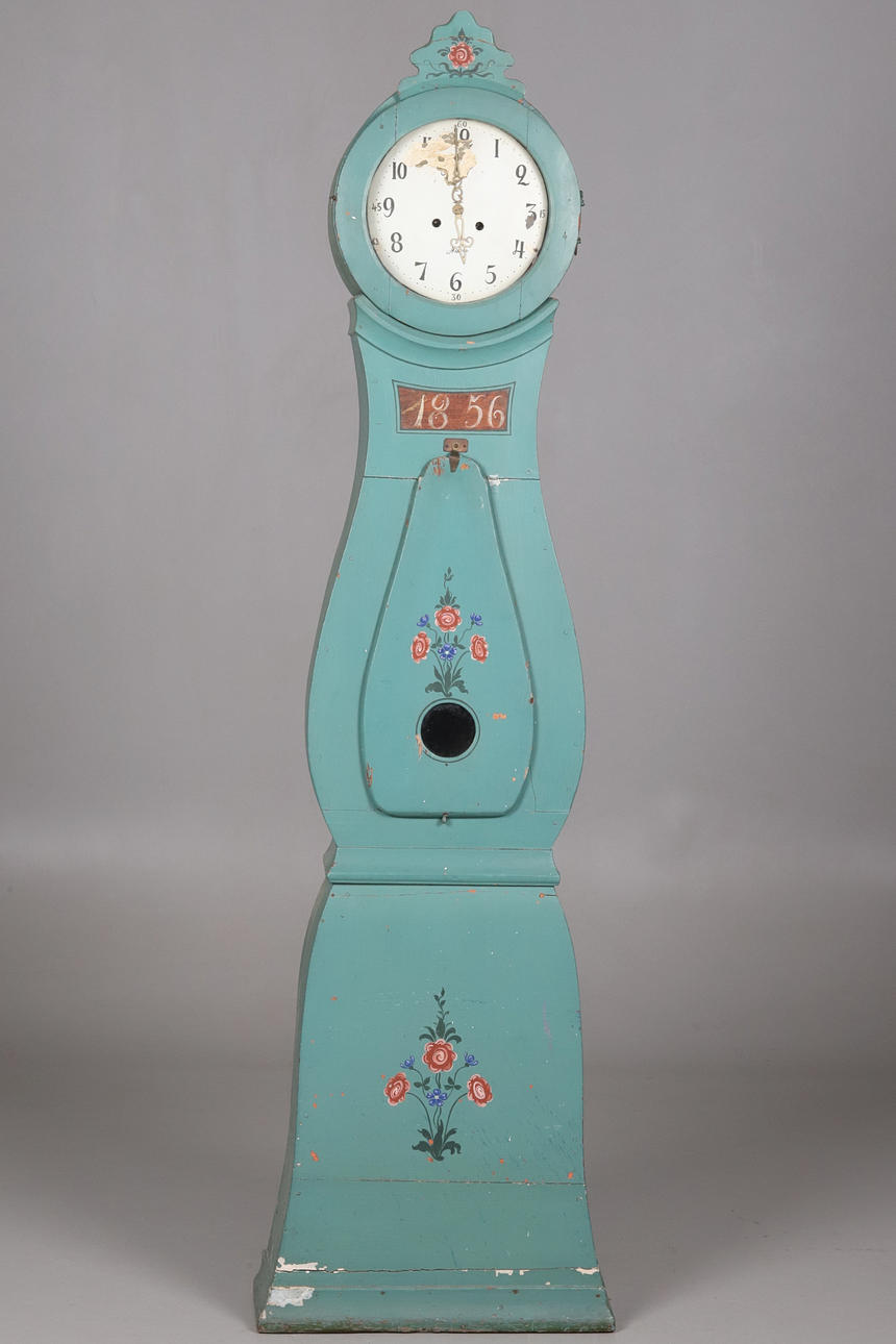Floor clock, decorative painted case, dated 1856.