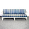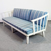 Sofa in light lacquered frame with openwork back, loose cushions with solid upholstery in shades of blue. Height approx. 75 cm, seat height approx. 42 cm, length approx. 205 cm, depth approx. 72 cm.