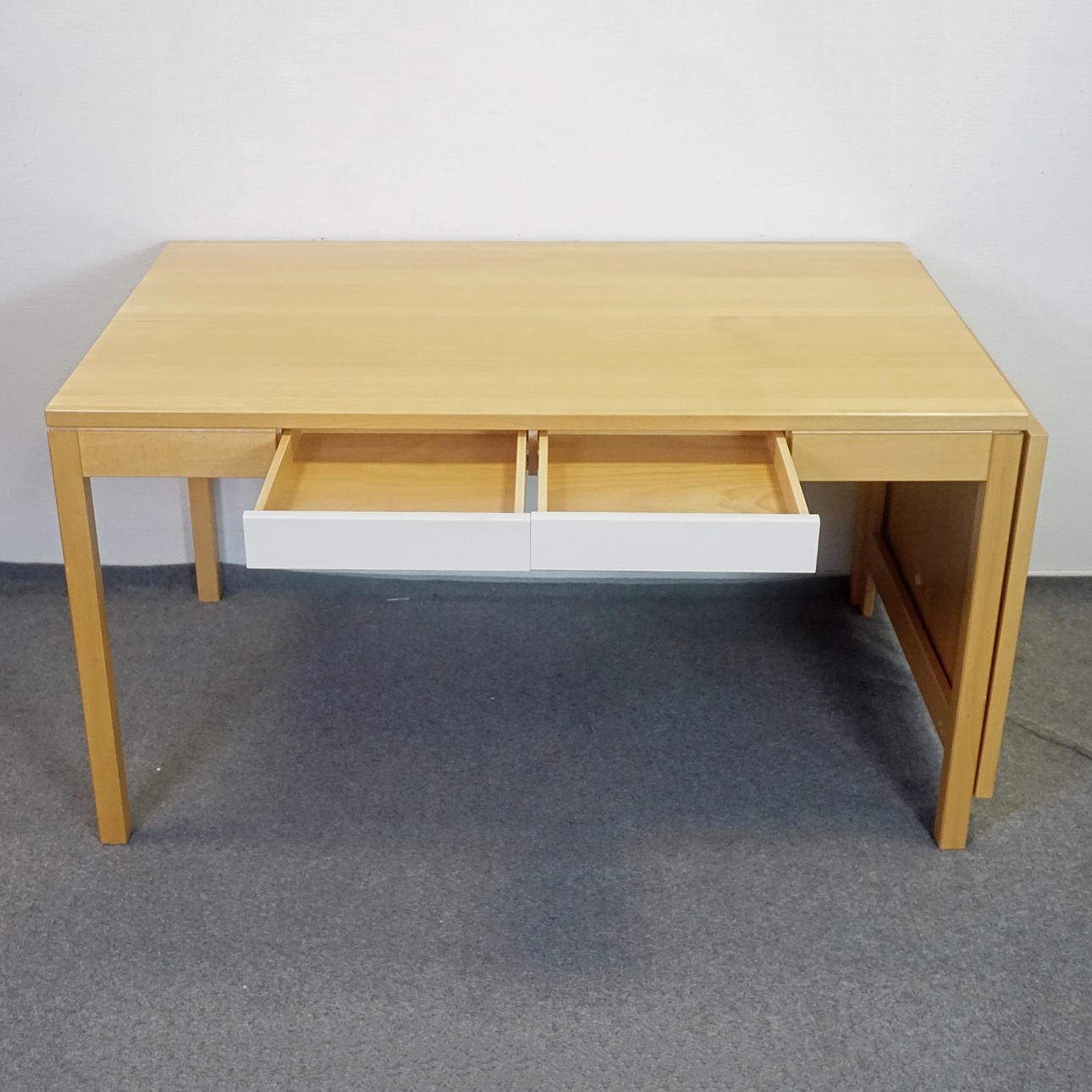 Rectangular dining table with a flap and 4 white boxes in the sargen.