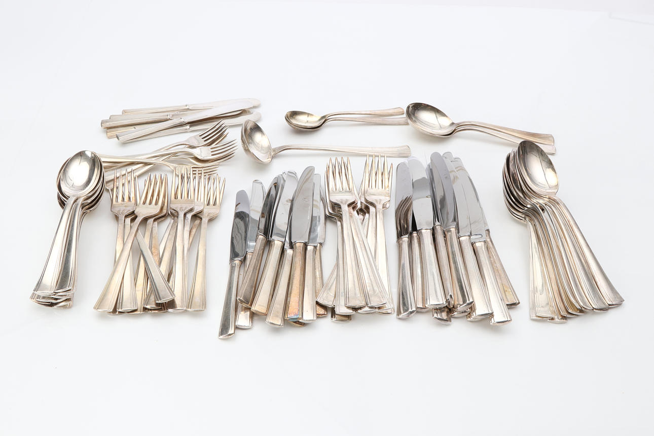 Consisting of: 12 forks, 19 cm, 12 knives, 22 cm, 12 spoons, 19.5 cm, 12 forks, 17.5 cm, 11 knives, 19.5 cm, 12 spoons, 18 cm as well as 17 serving cutlery, 15-19 cm.