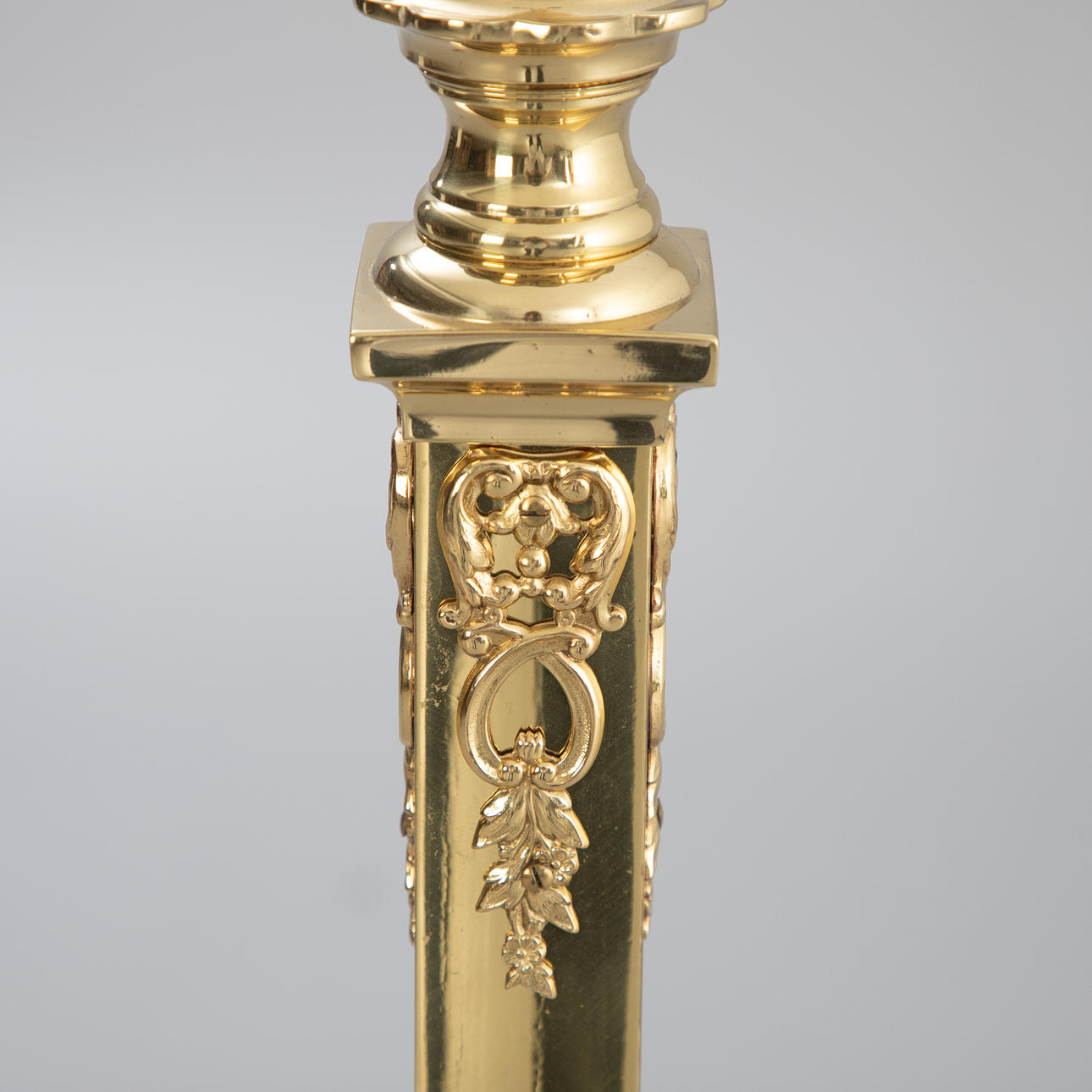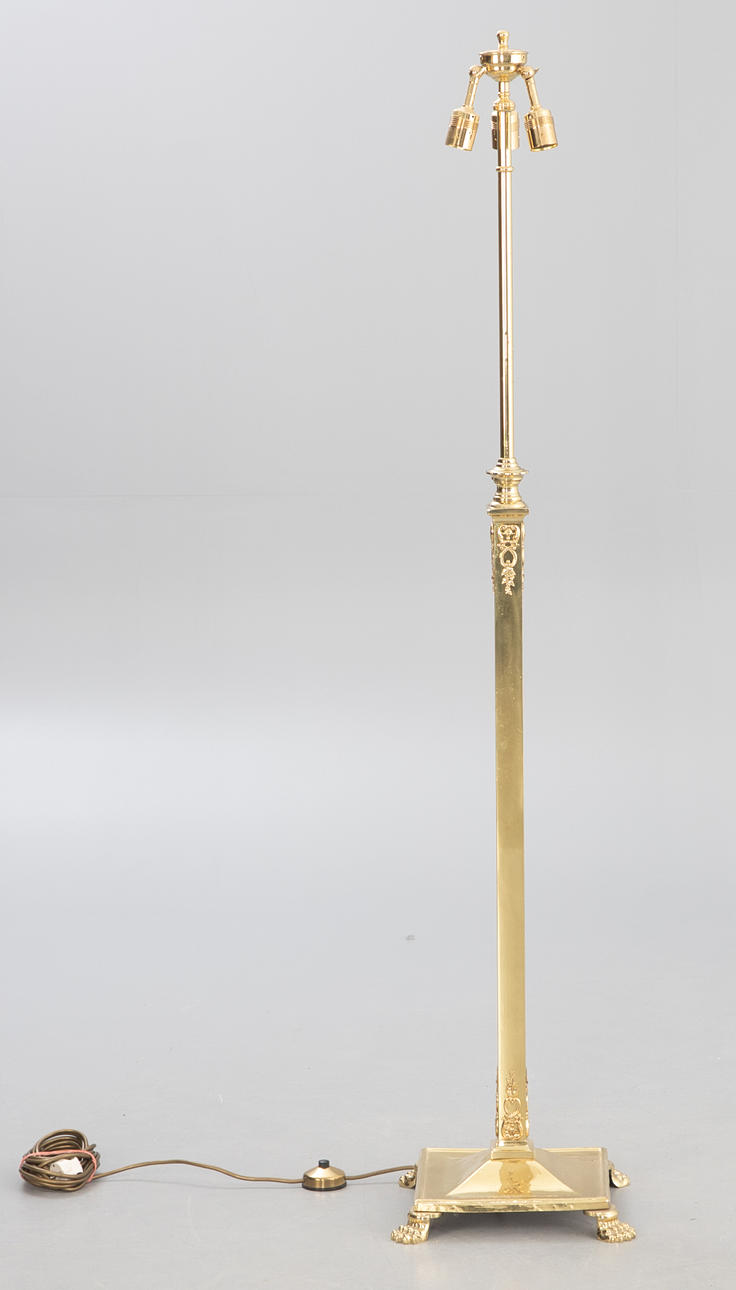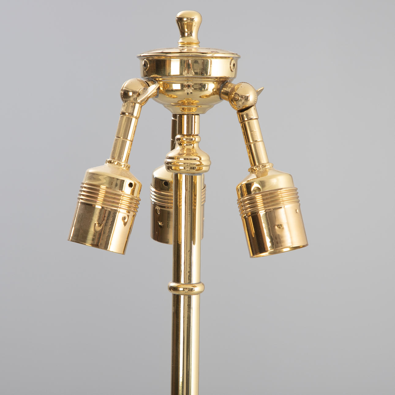 brass. Slightly rising square base on four paw feet. The smooth, square shaft at the roots with passive ornament applications. 3-flame electrified.