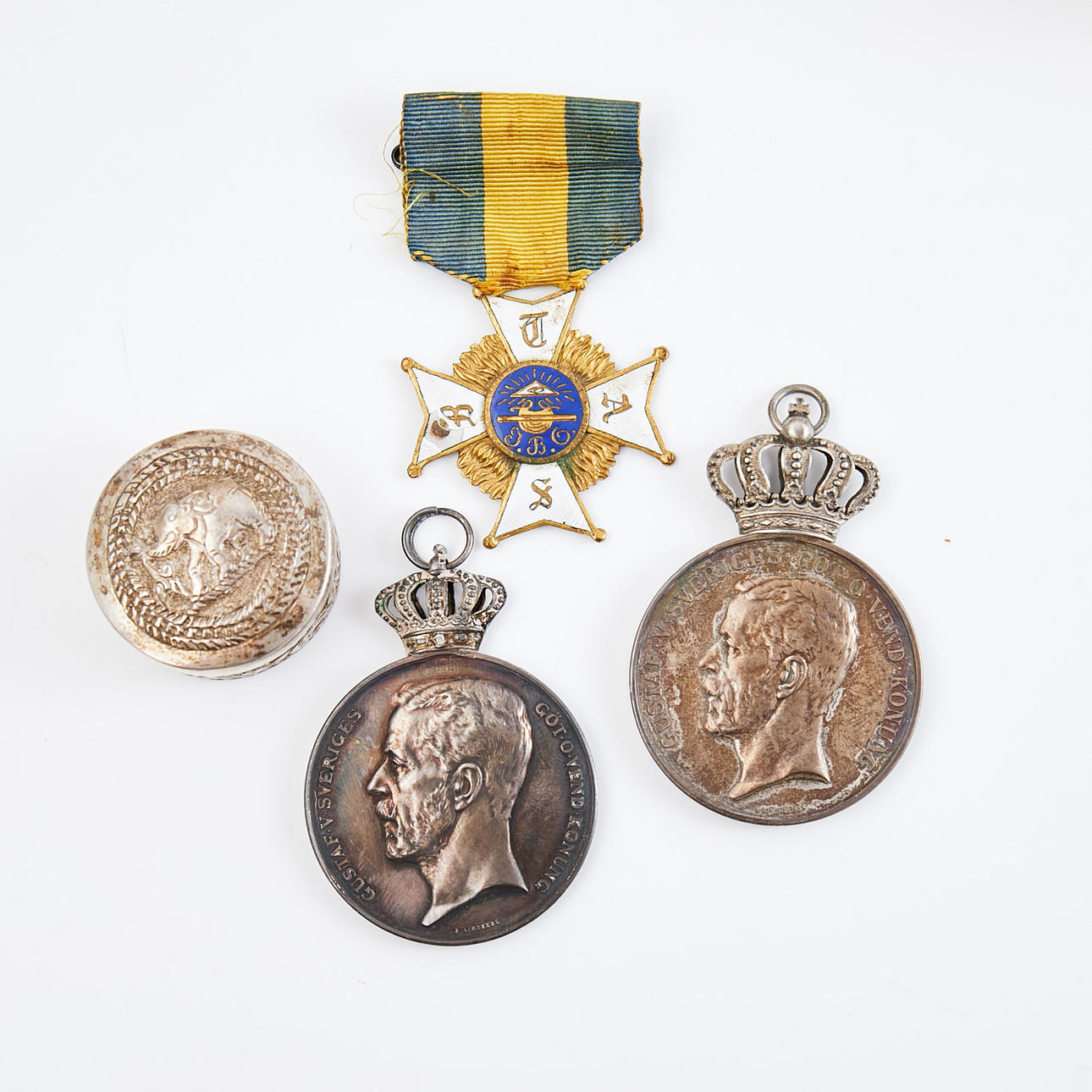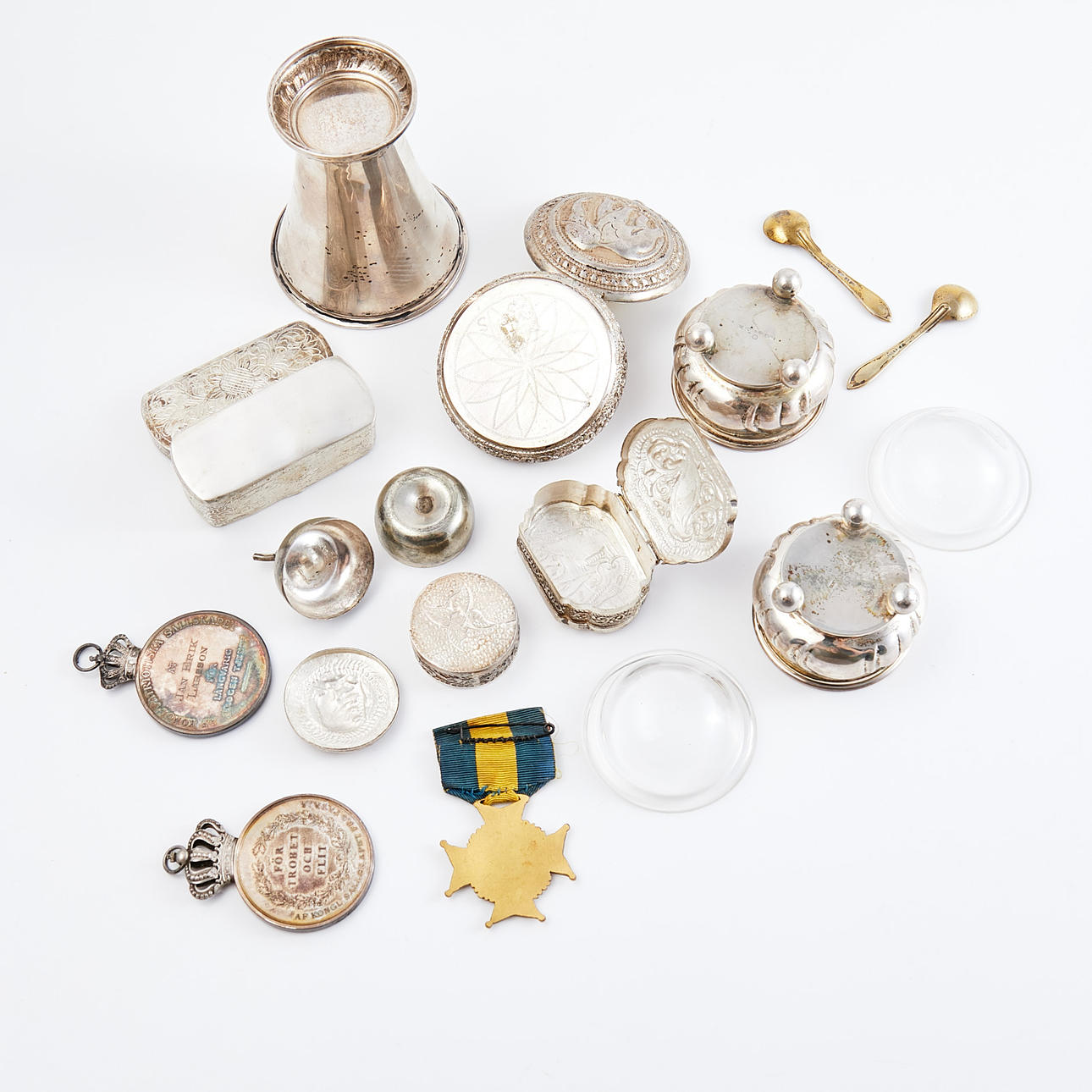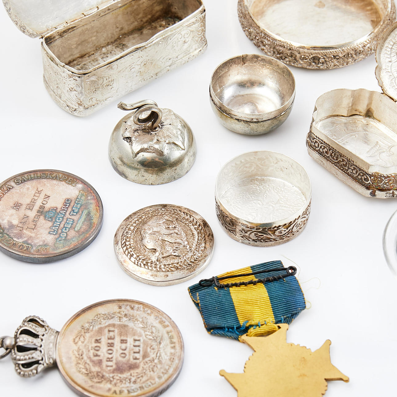 silver, enamel and metal, Sweden and Asia. Silver stamped items weight approx. 204 grams