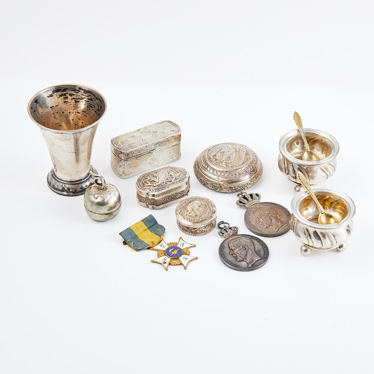 4295397. SILVER, 11 dlr, including medals, salt and pepper pots, goblets, etc.