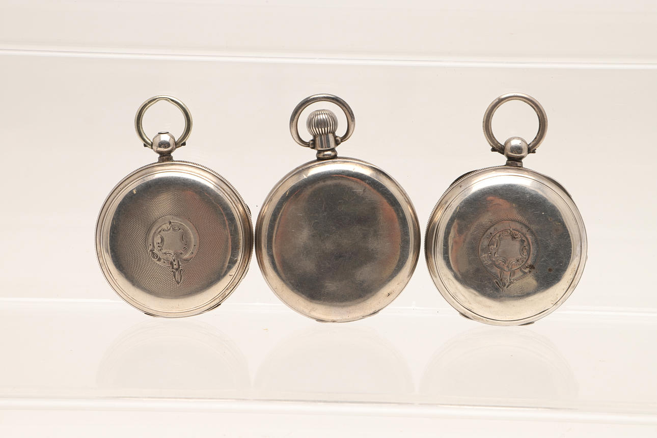 the white enamel dial with Roman numerals and subsidiary seconds dial, hallmarked for London 1878, the movement signed Garratt, London, with engine turned and cartouche decoration to the back case, 50mm dia., together with two other silver open faced pocket watches.