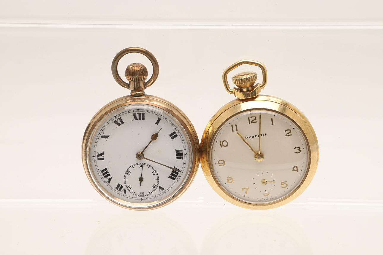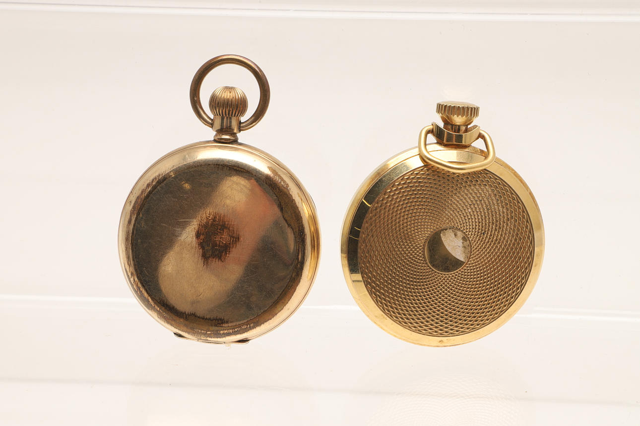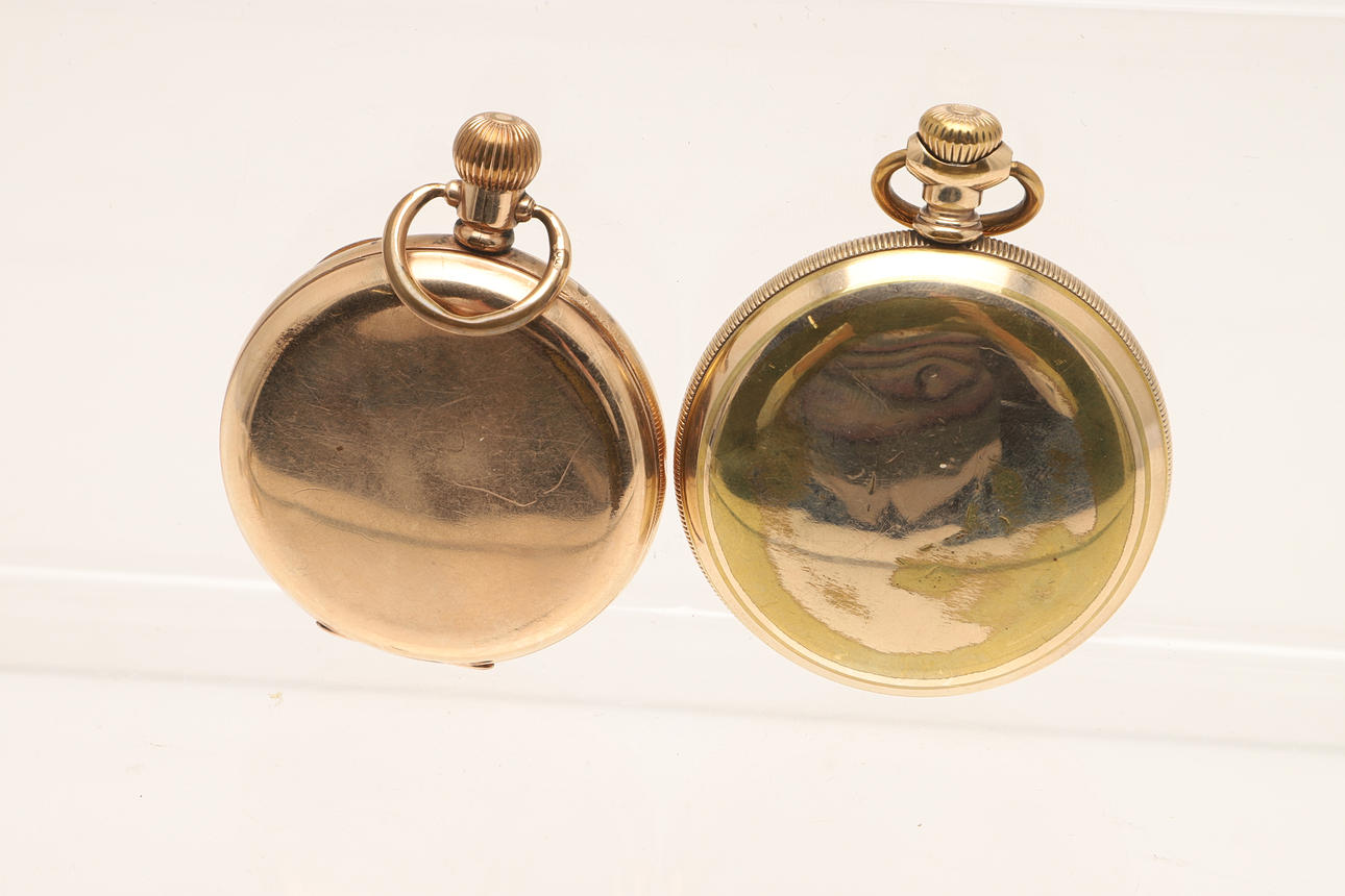 the signed white enamel dial with Roman numerals and subsidiary seconds dial, 50mm dia., together with another gold plated open faced pocket watch by Elgin and five other assorted gold plated pocket watches.