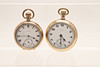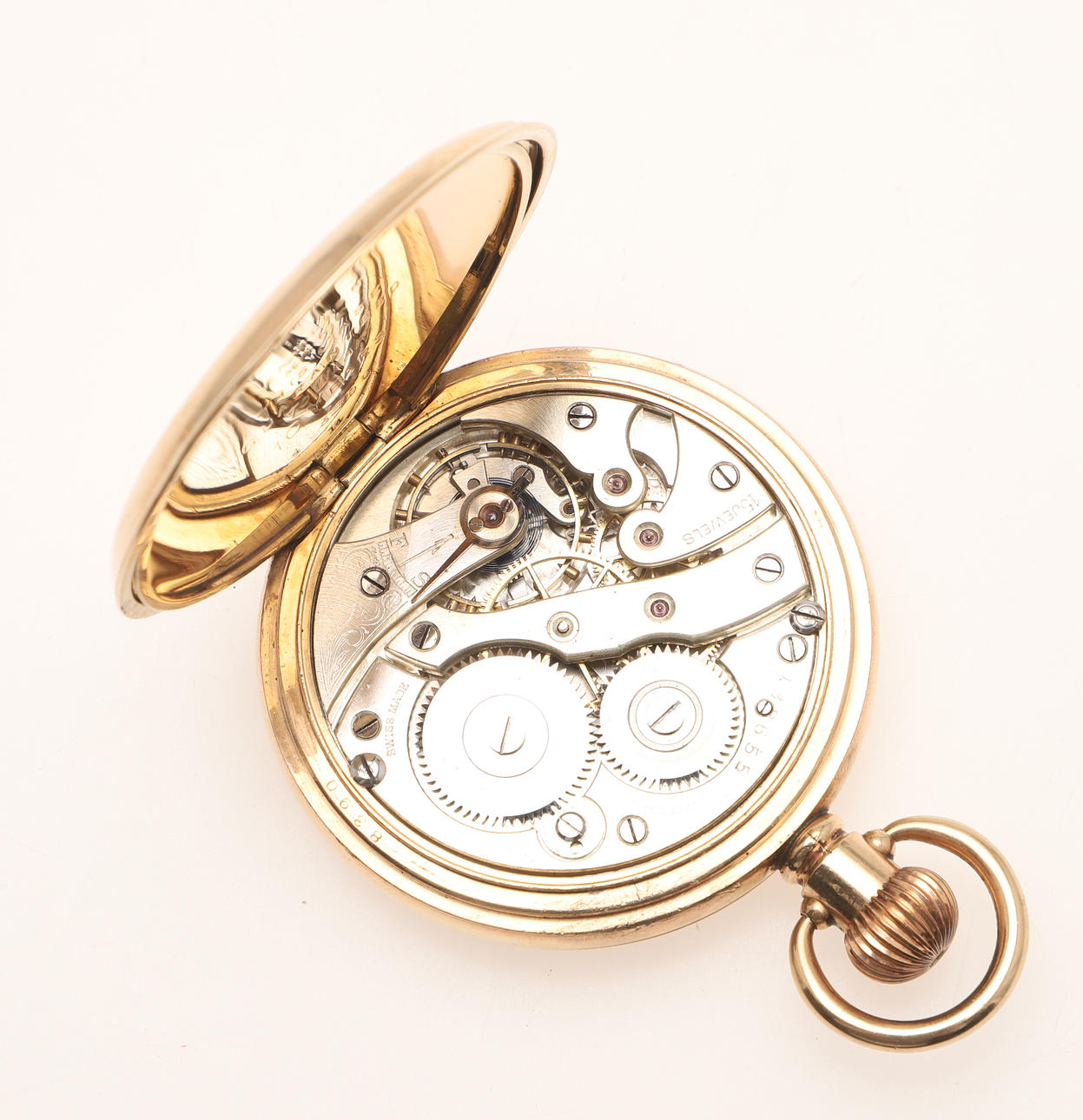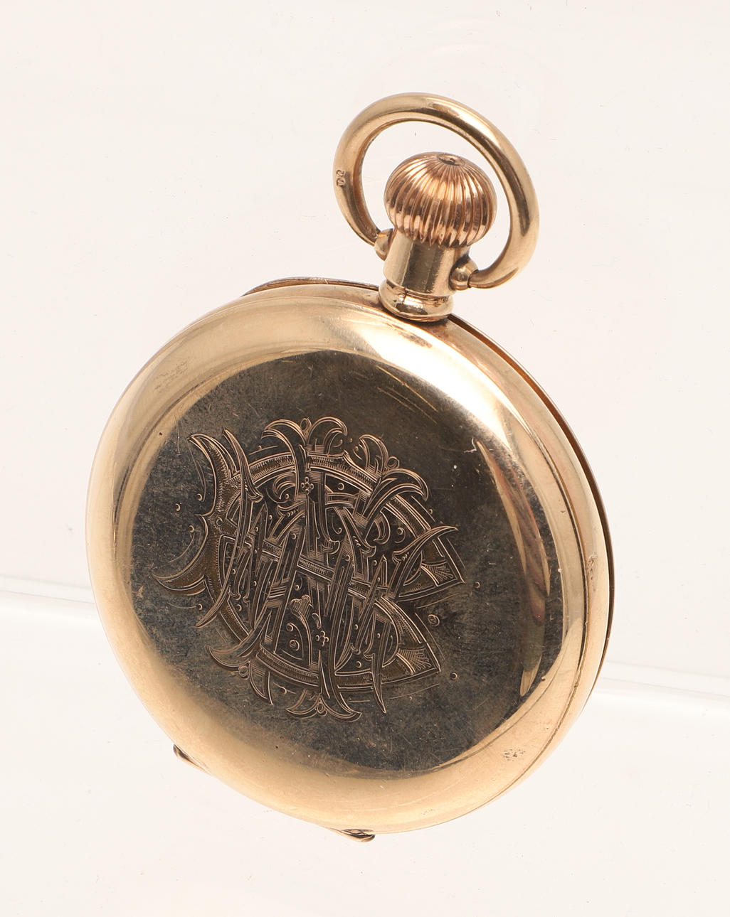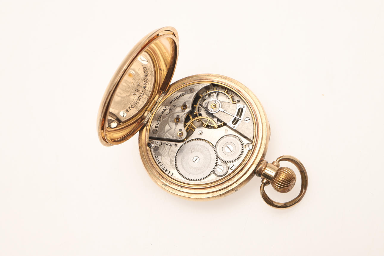 the signed white enamel dial with Roman numerals and subsidiary seconds dial, 50mm dia., together with another gold plated open faced pocket watch by Elgin and five other assorted gold plated pocket watches.