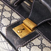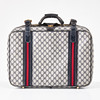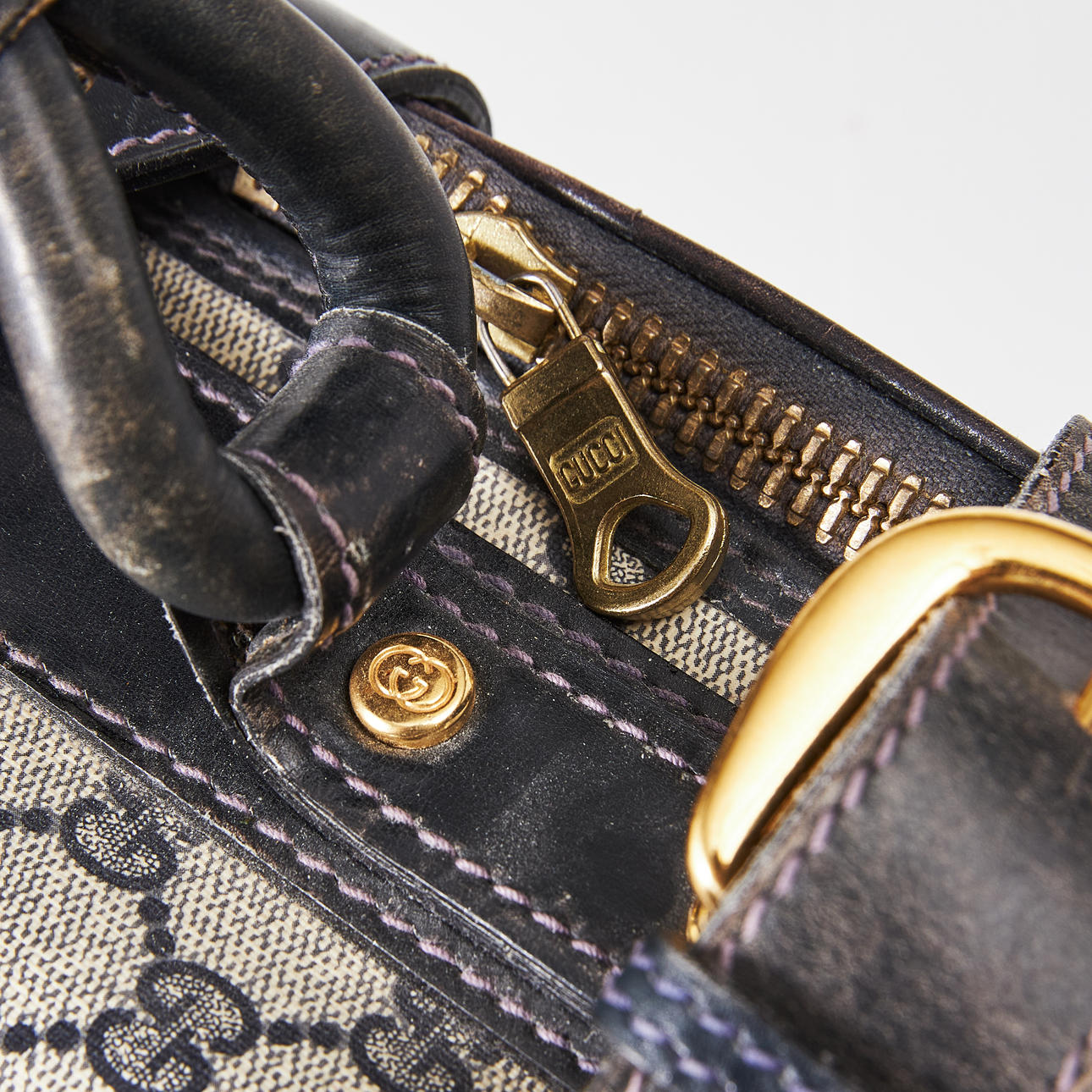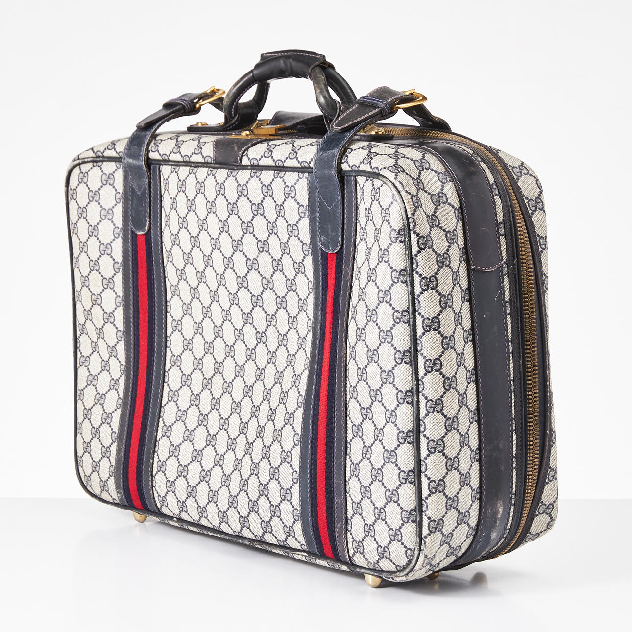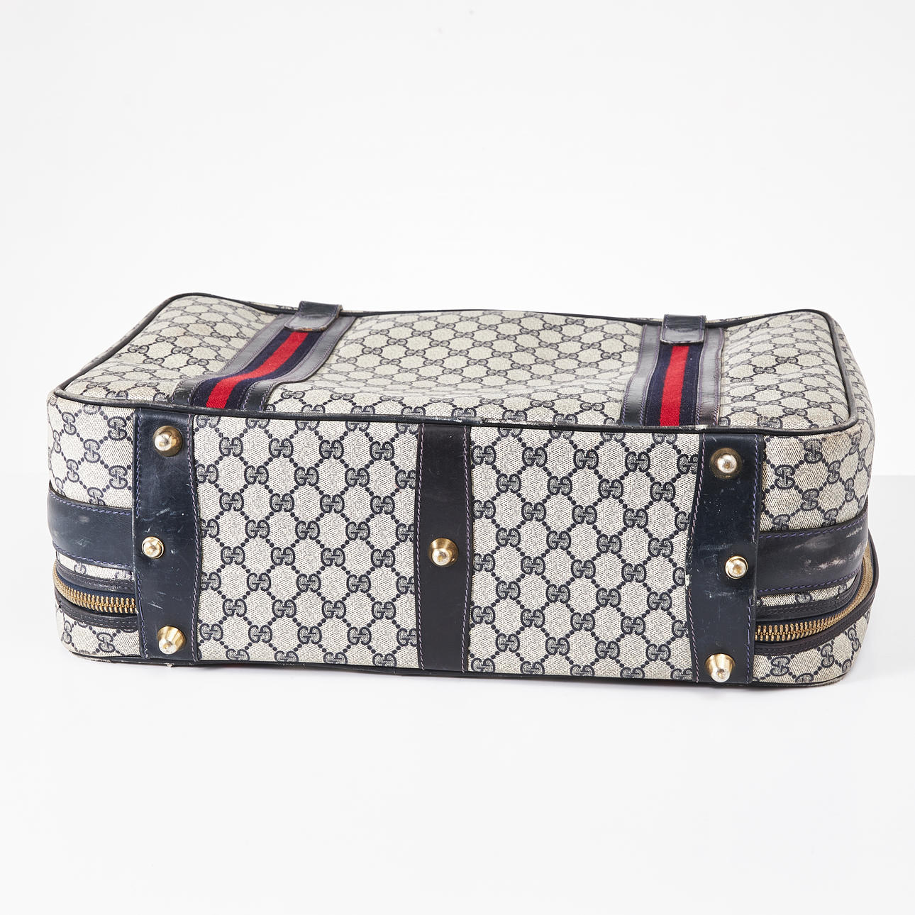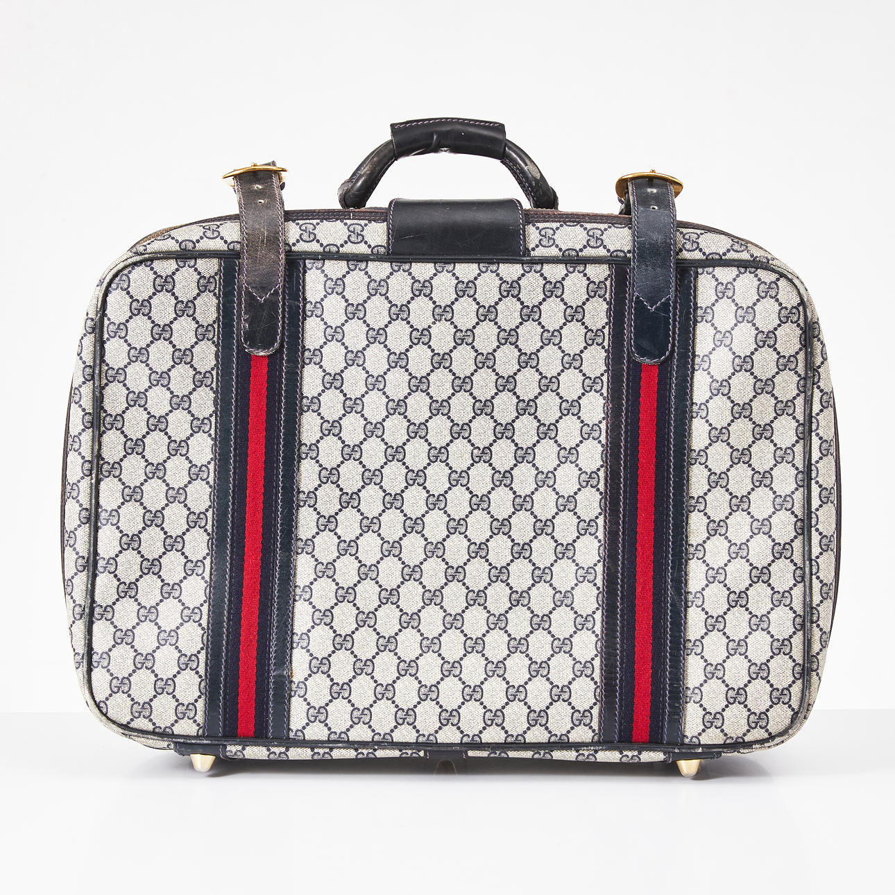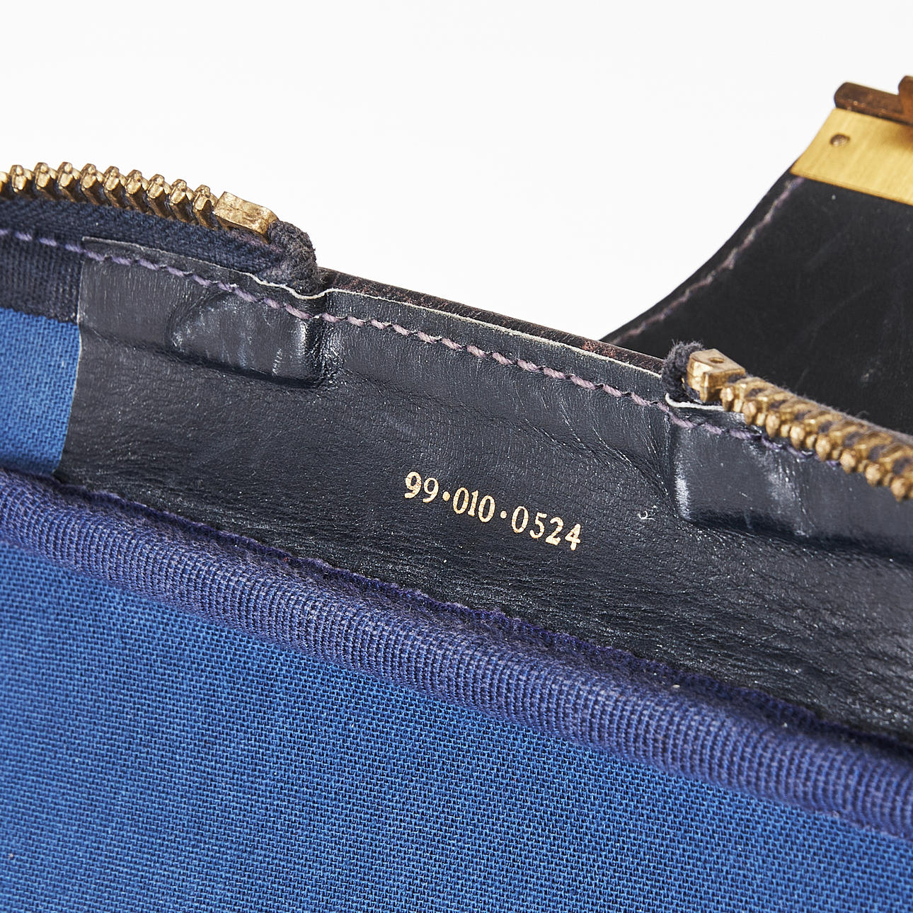 Monogram canvas with classic logo pattern and details of blue leather, decor with strips of textile in blue and red, approx. 37x50x15 cm.