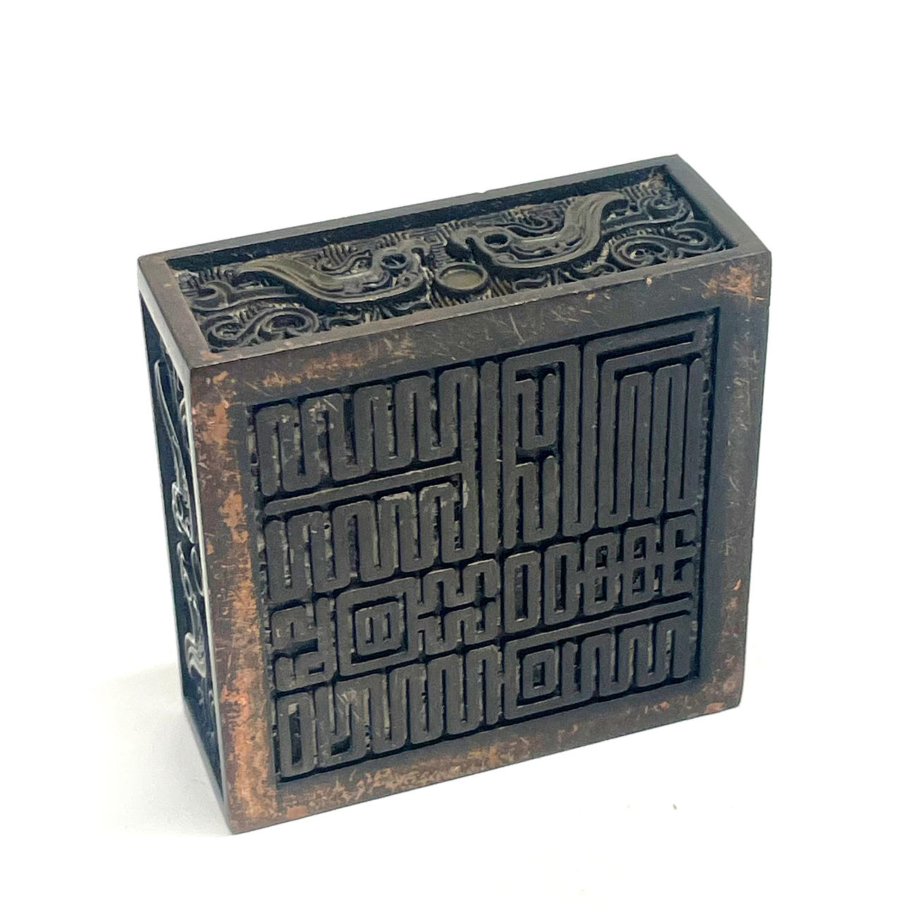 A Chinese bronze scholars seal, size 5.5cm x 5.5cm x 5cm.