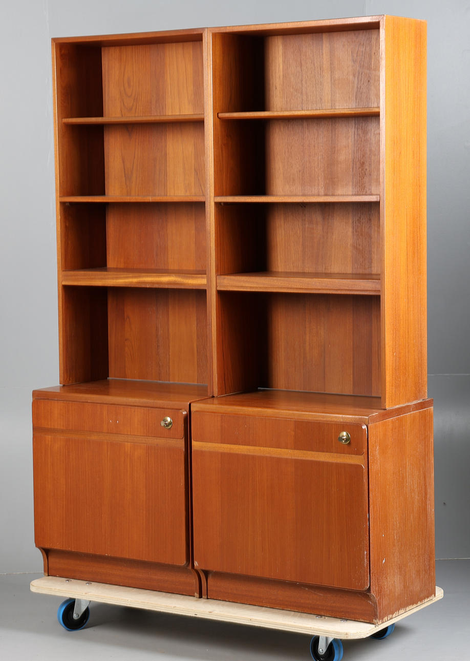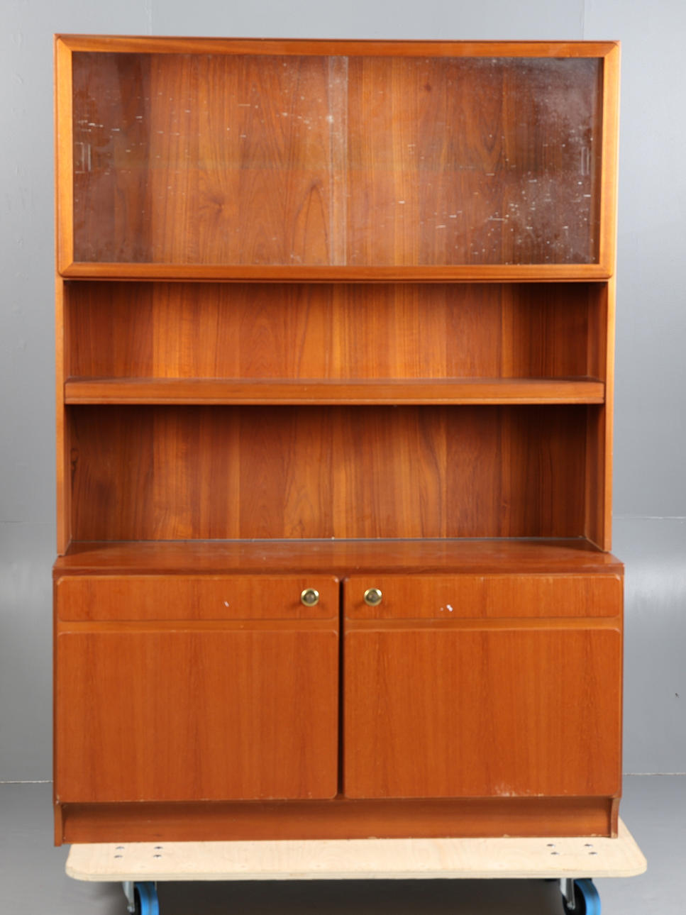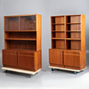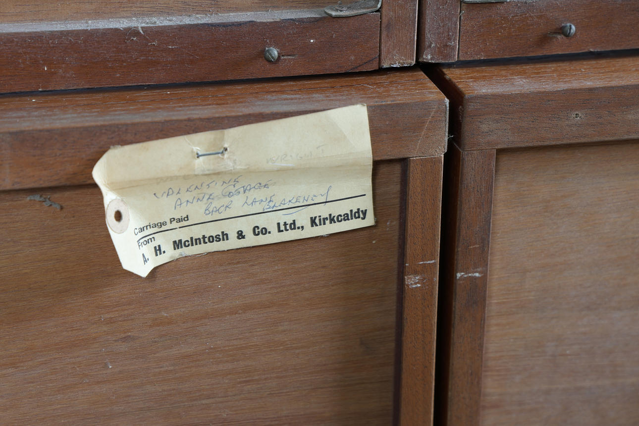 Three mid 20th Century wall units by McIntosh of Scotland, including a glazed display cabinet on sideboard, together with two bookcases on cabinets, each cupboard door reveals a single shelf, smaller units labelled to the backs, measuring 170.5cm height and 43cm depth, larger unit measures 120cm width and smaller units measure 60cm width. (3).