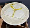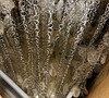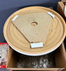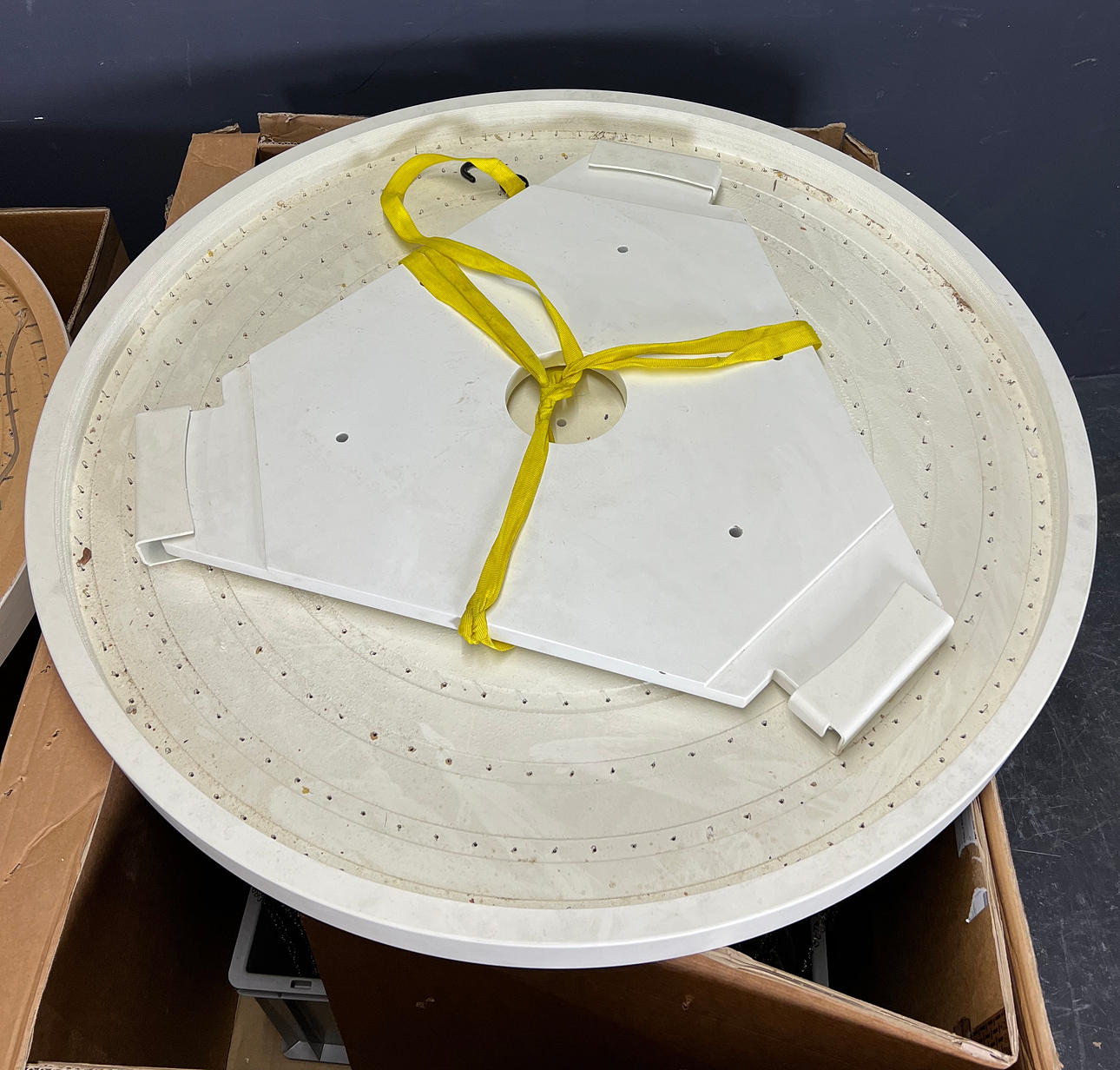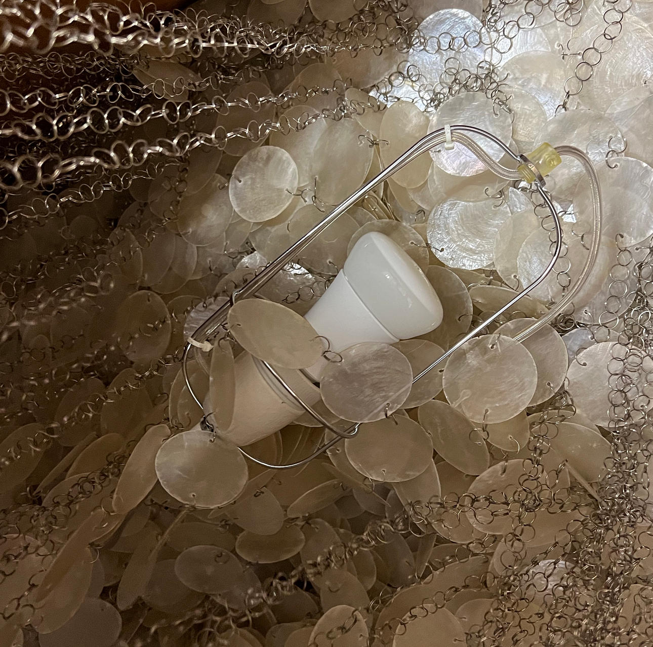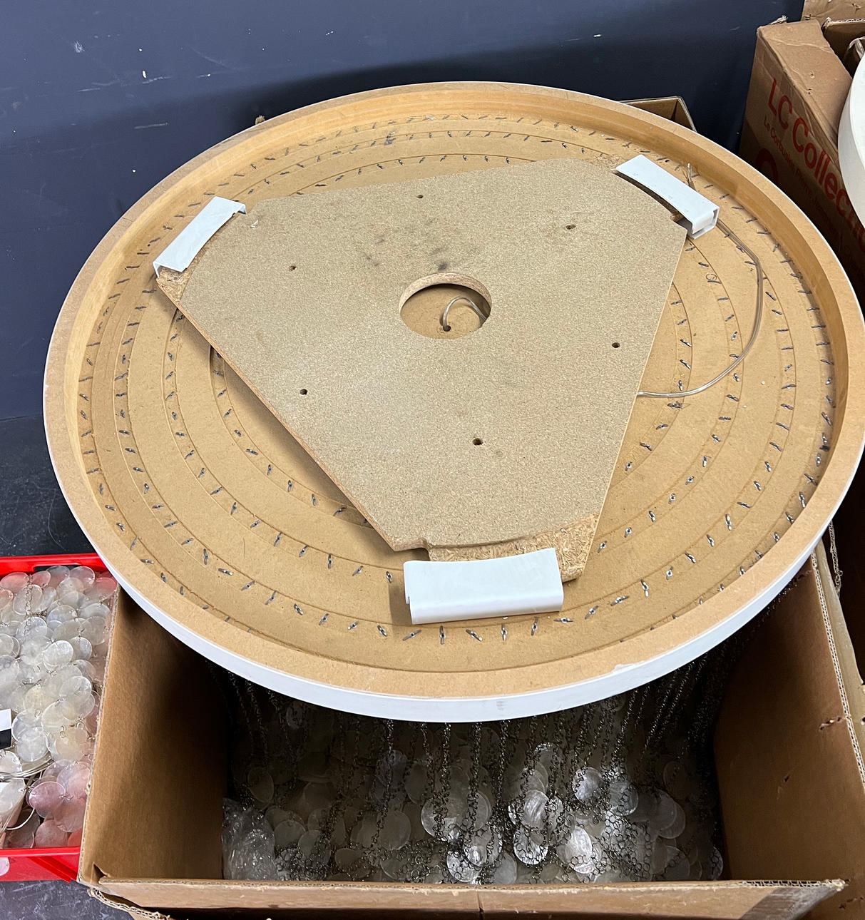 Partially painted wooden ceiling plate, metal rings with shell plates.