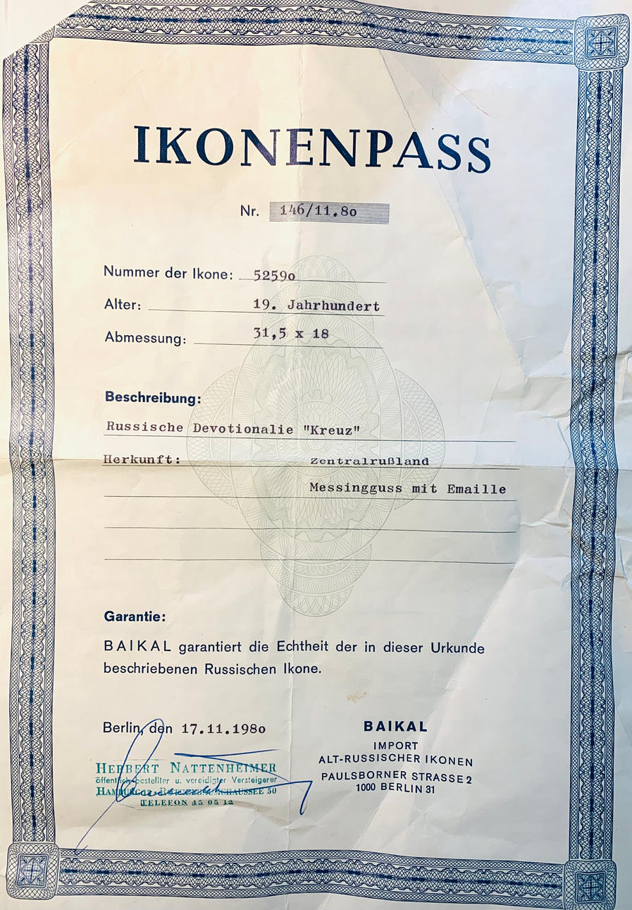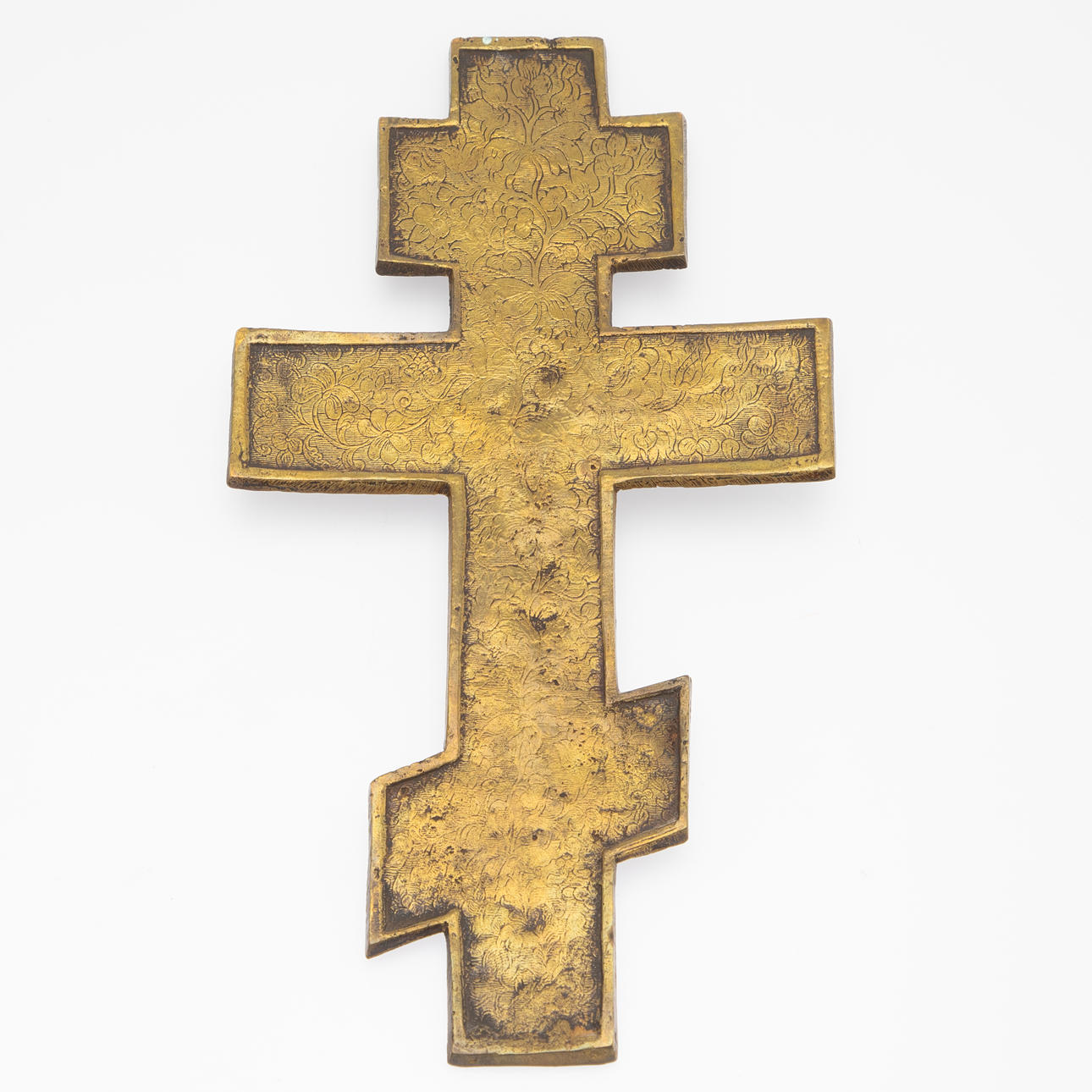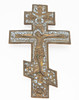 Bronze, light blue enameled. Christ on the cross, the Mandylion at the top, a worshipping angel on the right and left, the Jerusalem city wall below, including a skull. With Cyrillic characters. Plant ornaments in bas-relief on the back.