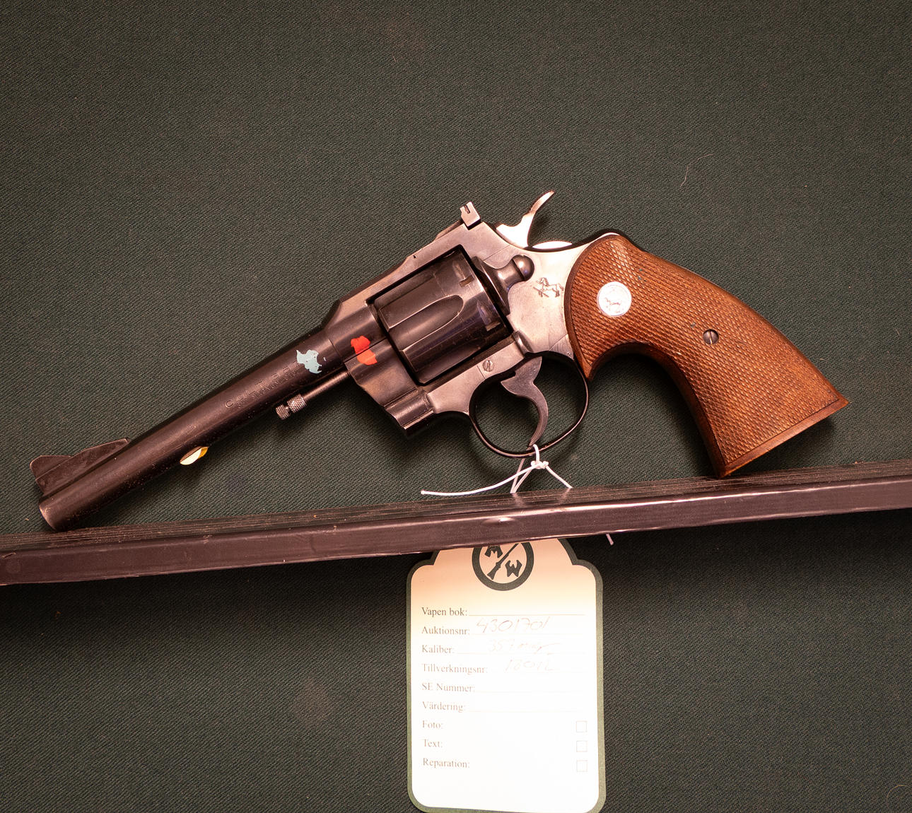Revolver American Make Colt Model 357. Caliber 357Mag. Additional No. in 18012. Spout length 15cm. Adjustable sight. Piston sides made of wood.