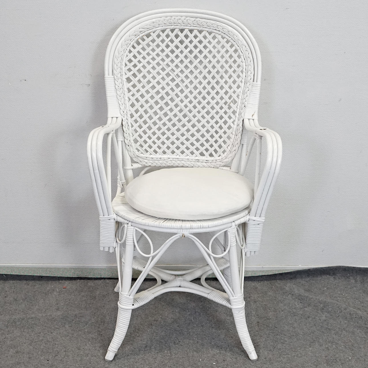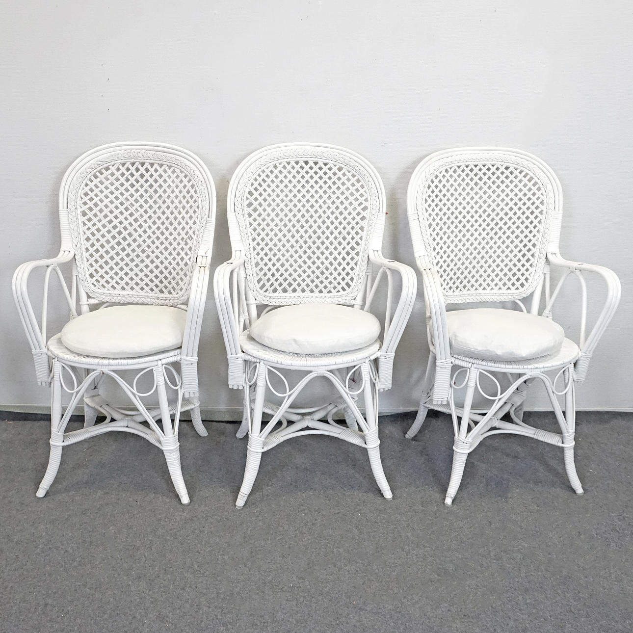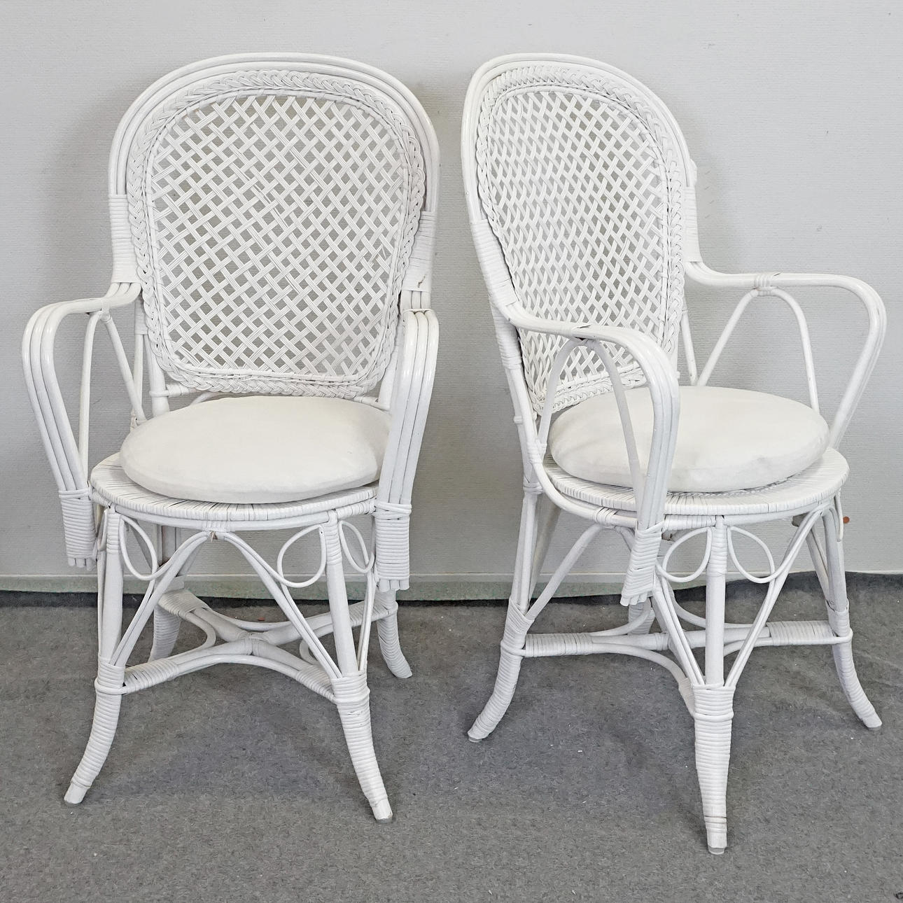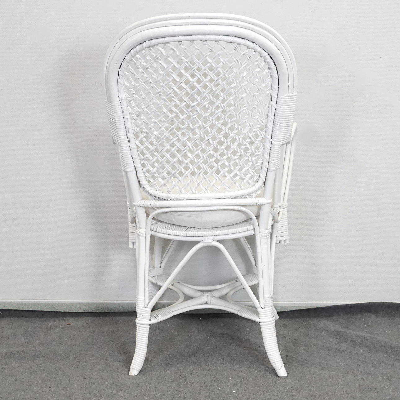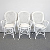 6 wicker chairs, white painted, height approx. 96 cm seat height approx. 44 cm, width approx. 55 cm, depth approx. 55 cm. 4 seat cushions, Engmo half-down, included.