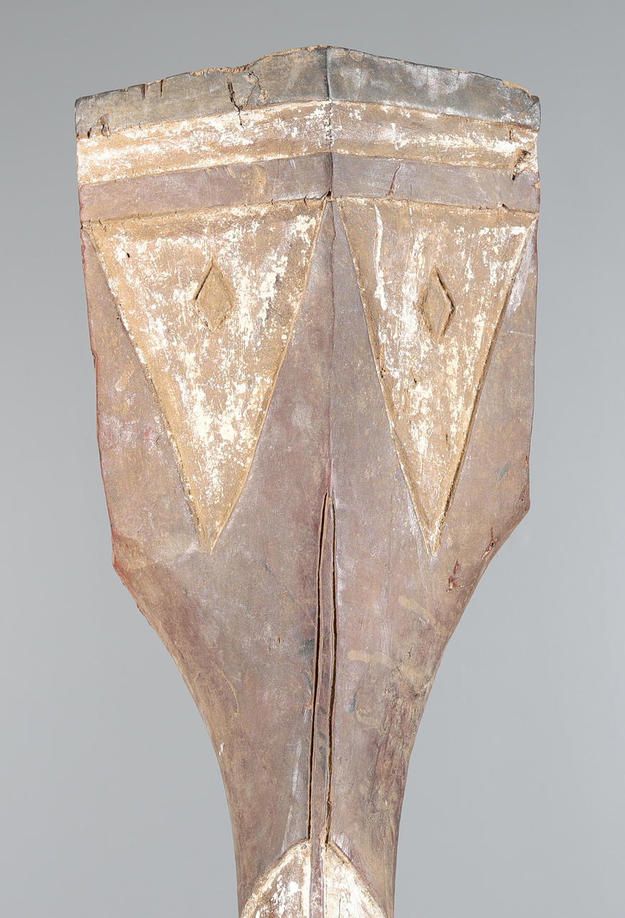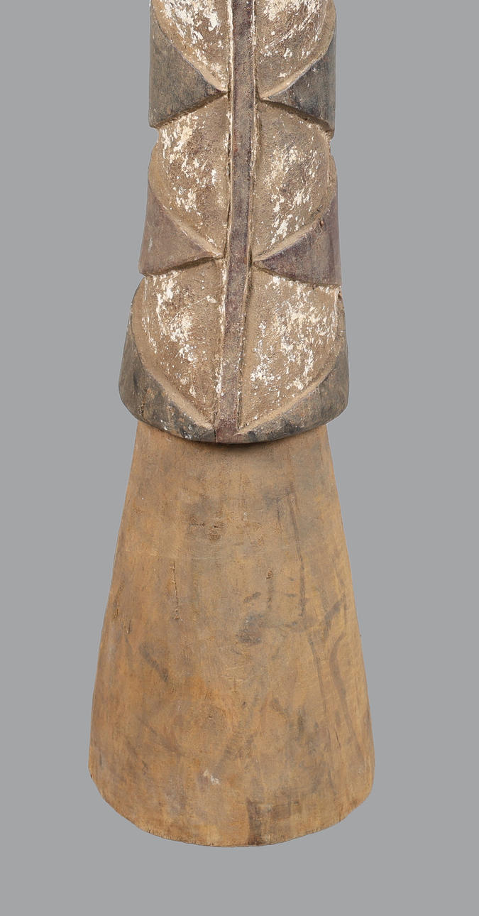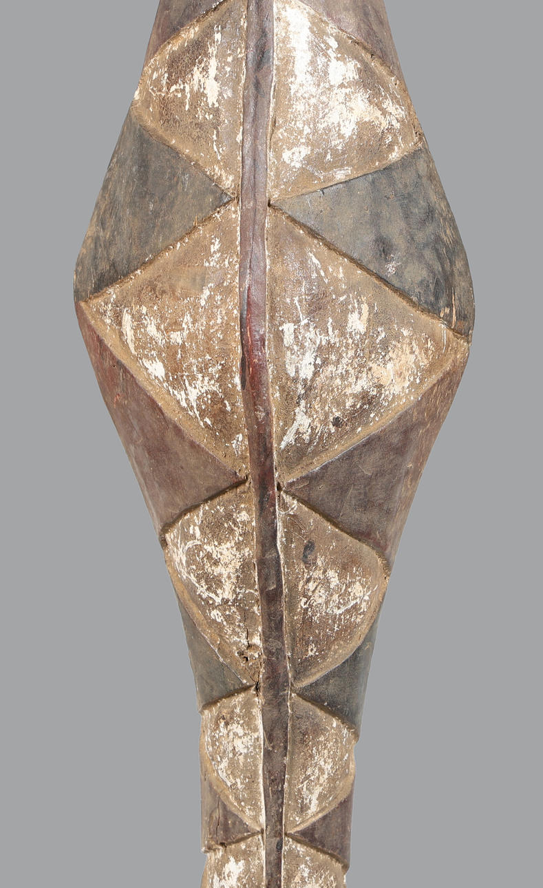 Second third of the 20th century, The surface is carved with deeply incised triangular and lozenge-shaped motifs painted in white and dark pigment, following the sinuous curve of the piece from head to tail, with a strong central ridge and alternating scale patterns running the length of its spine. 212cm high 34cm wide