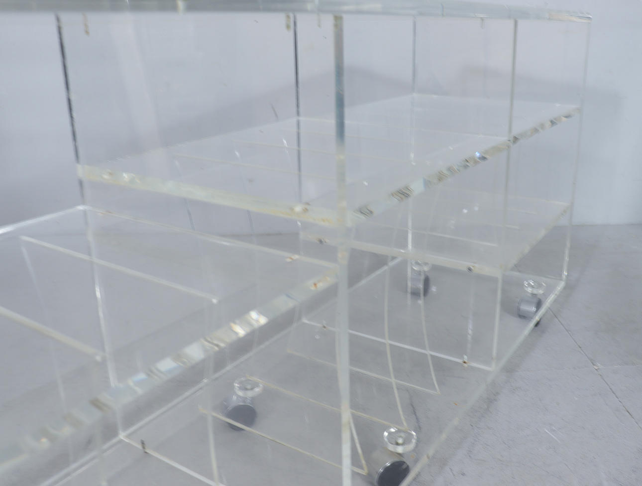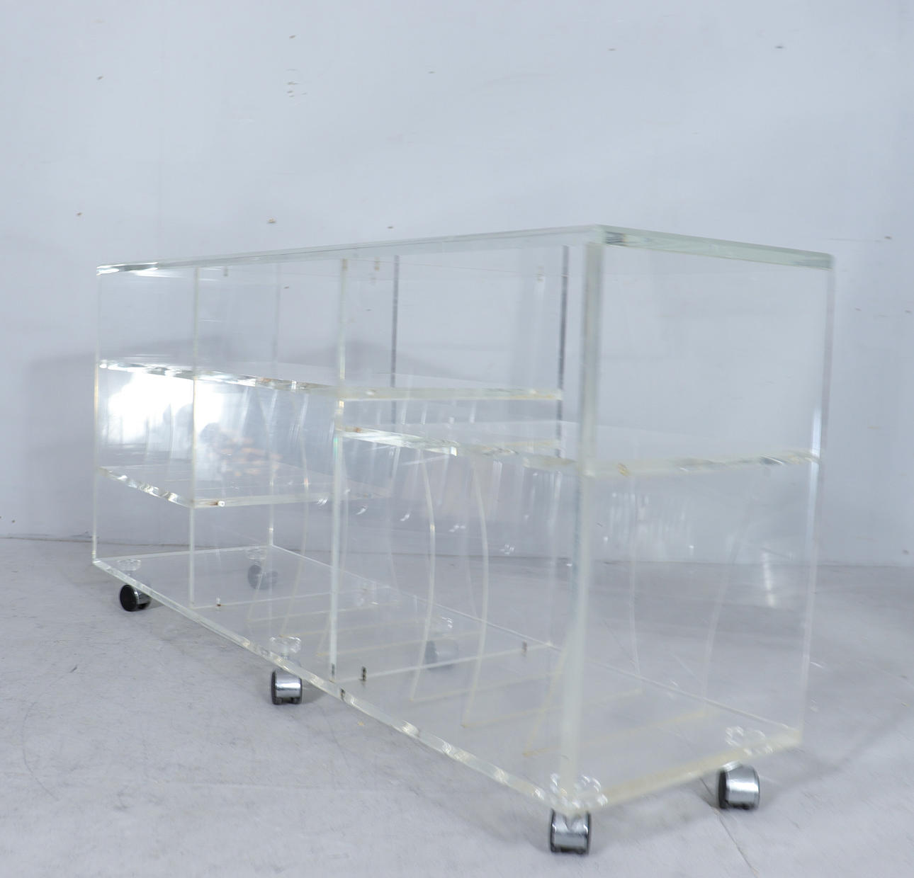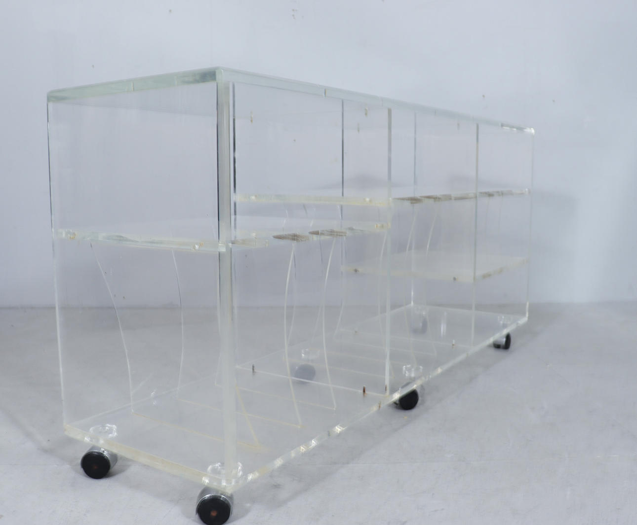 Mid century plexiglass shelf/sideboard, rollable, Germany, 1970s, solid construction made of plexiglass/acrylic glass,