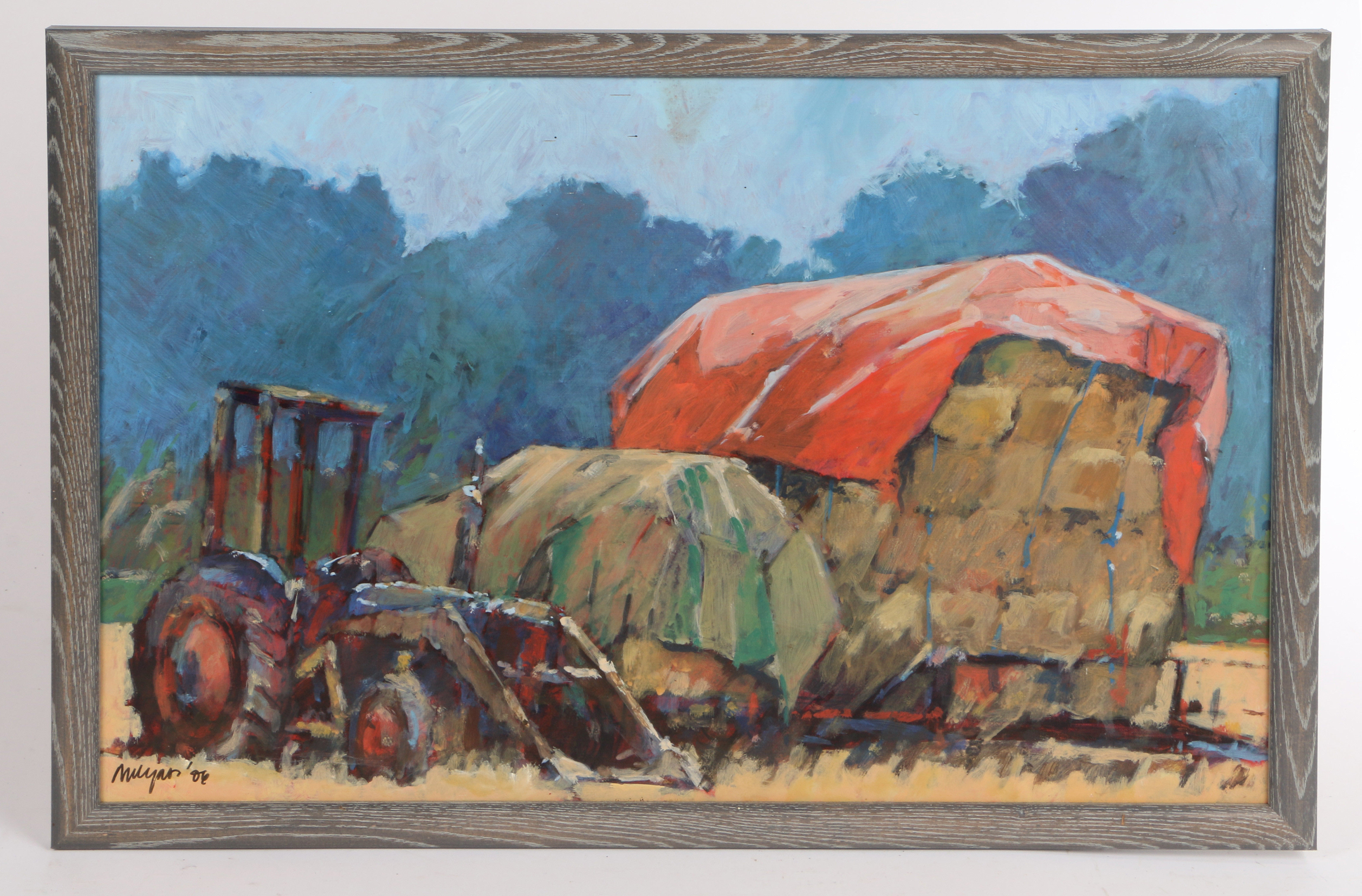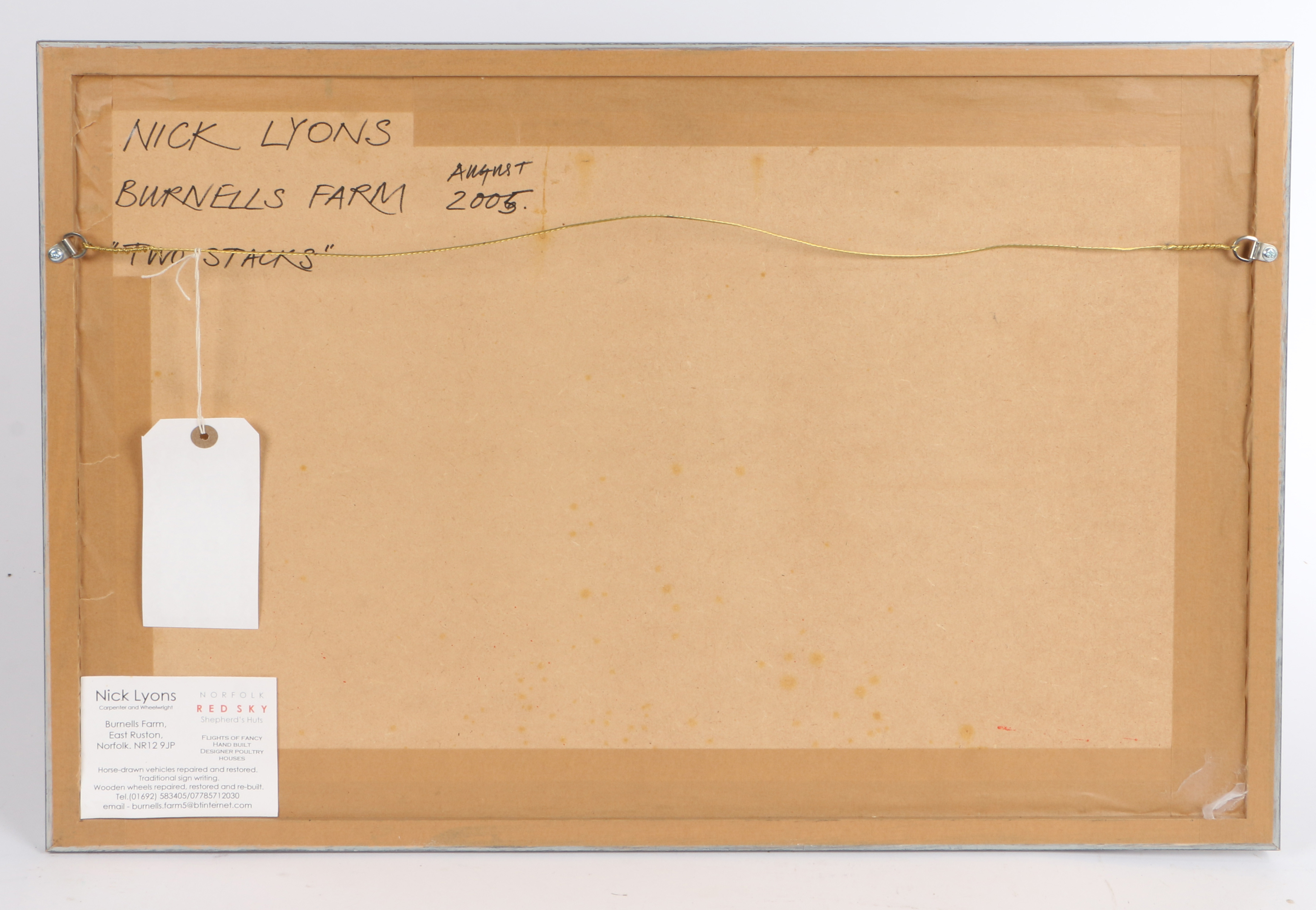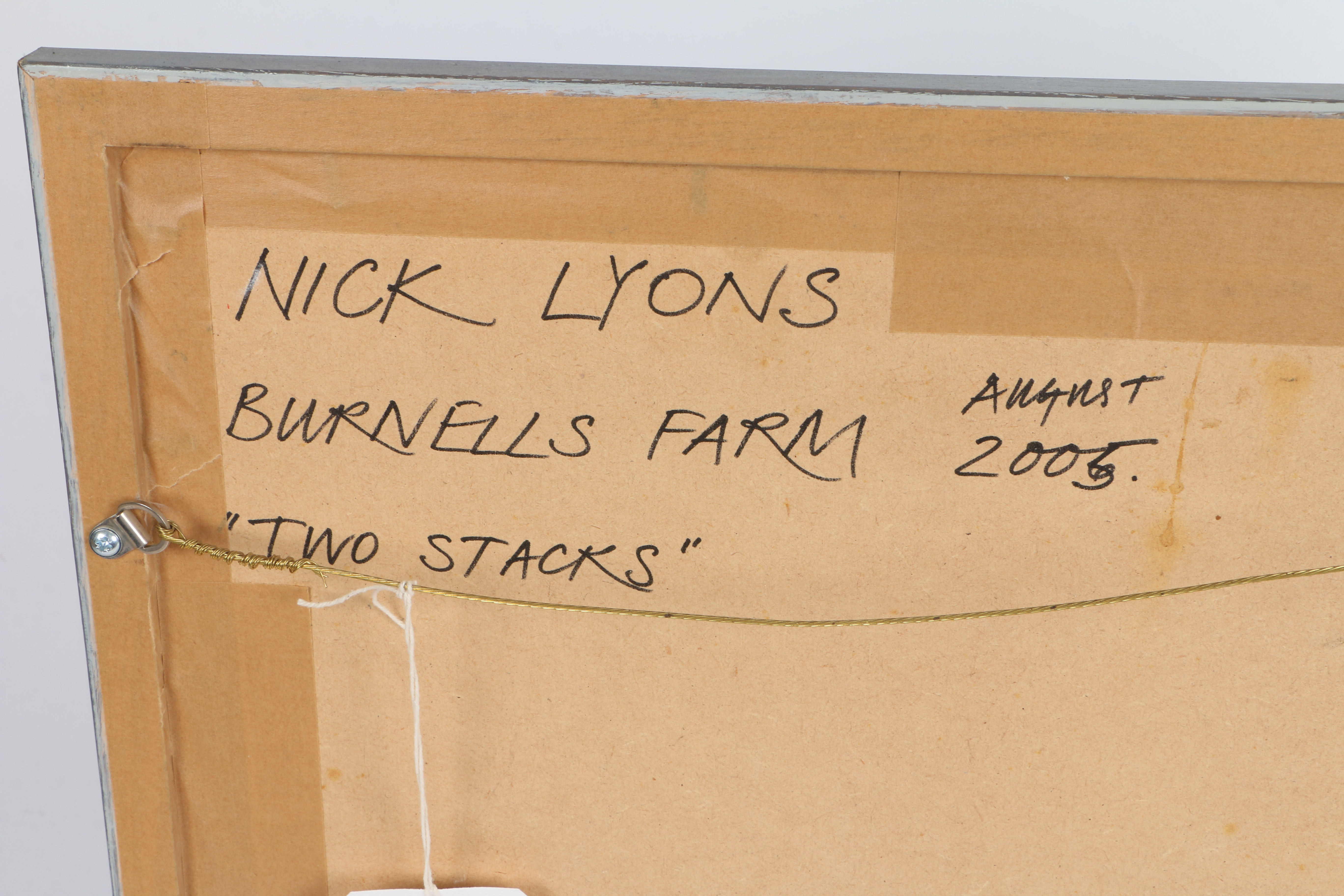 4304634. NICK LYONS (BRITISH, B.1954) 'BURNELLS FARM, TWO STACKS'.