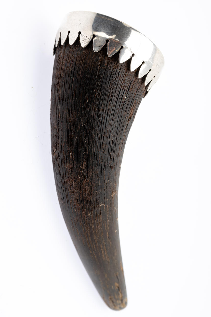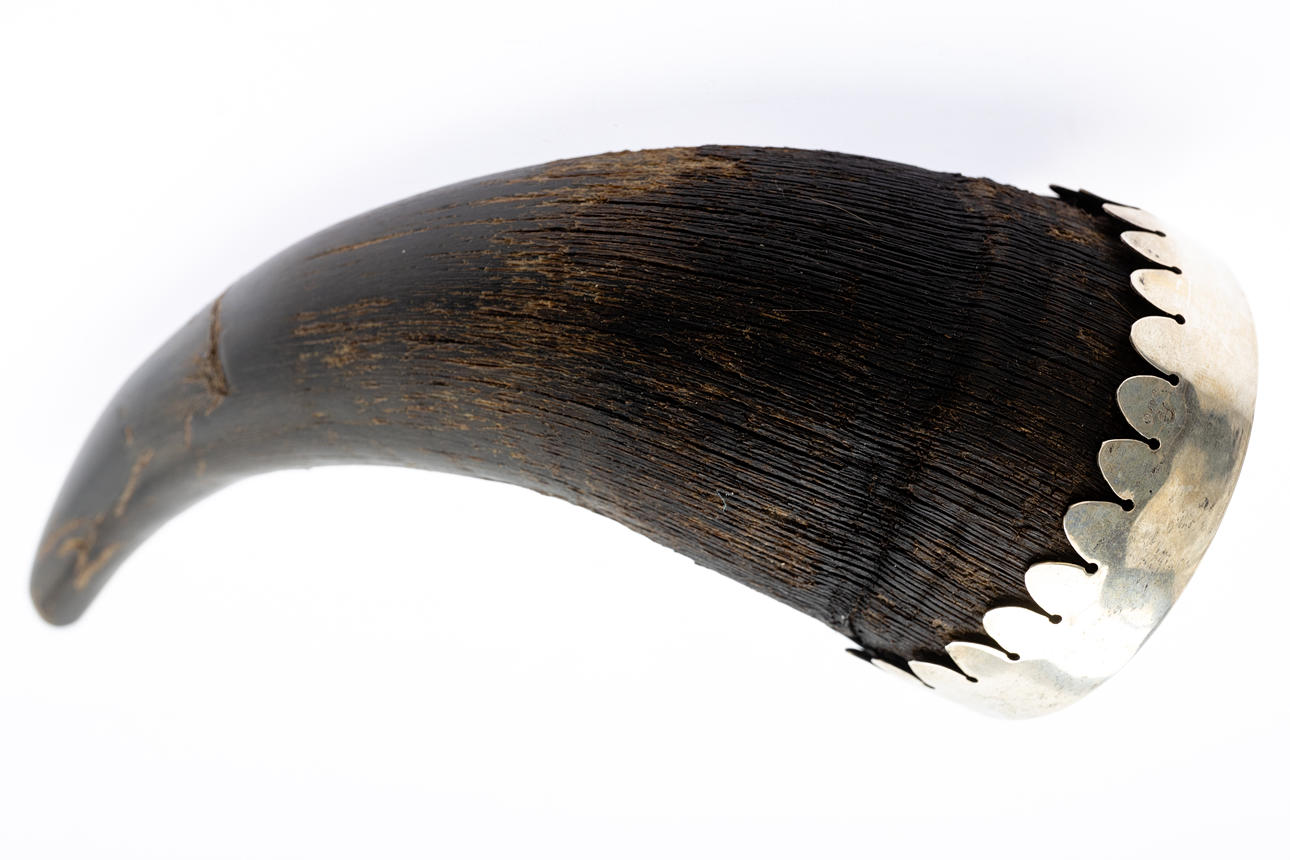 830 silver drived/buffalo horn tips. In various versions. Mulched driven mug with folded edge and cut-out lace border. Silver stamp with crescent and crown. L. ca. 21 cm and 27 cm.