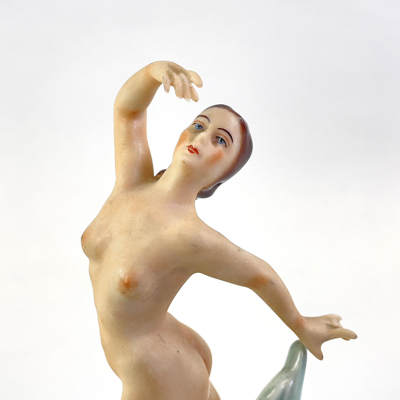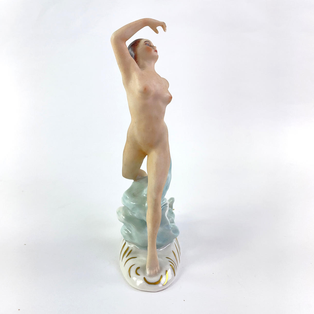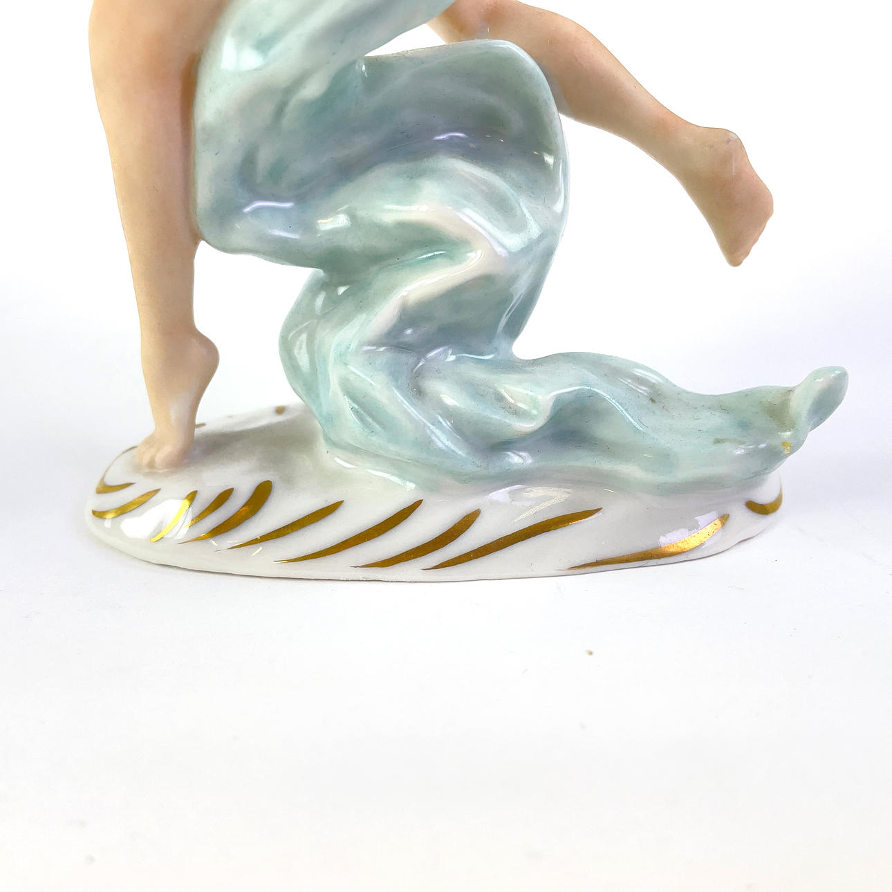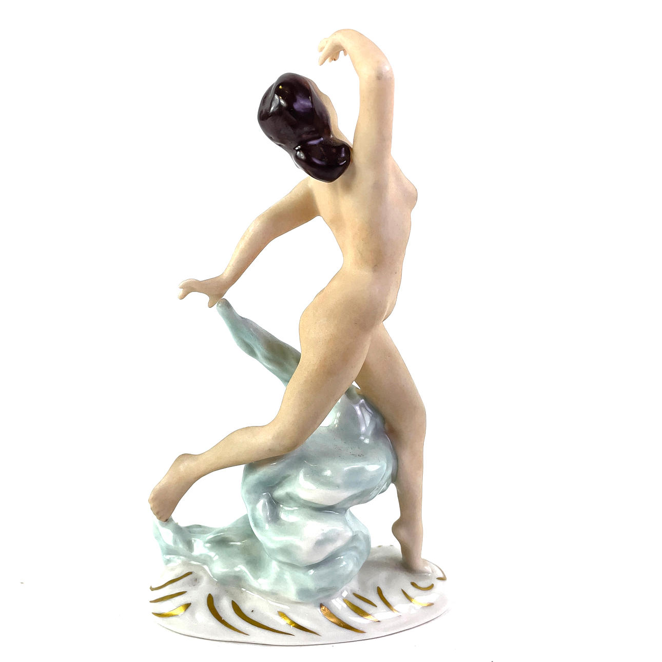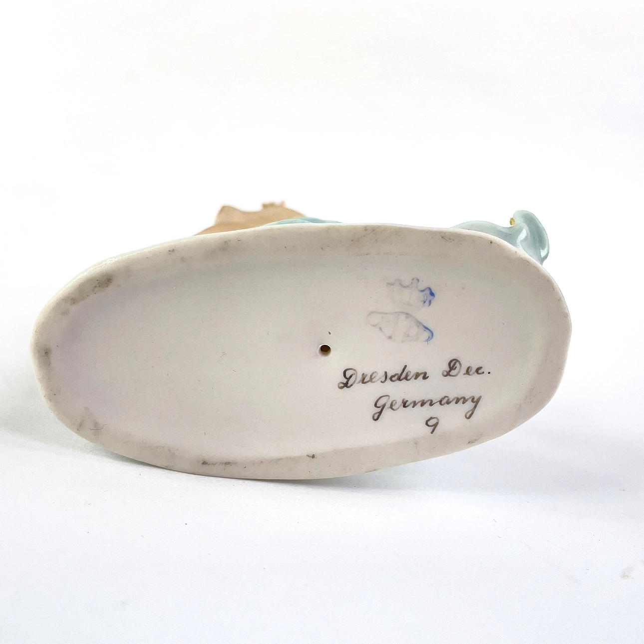 Porcelain figurine depicting a dancer. Tagged under “Dresden Germany”. Approx dimensions: height 16 cm, width 9 cm, depth 6 cm.