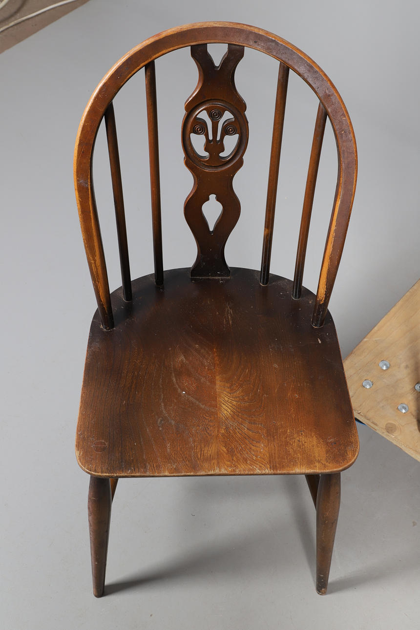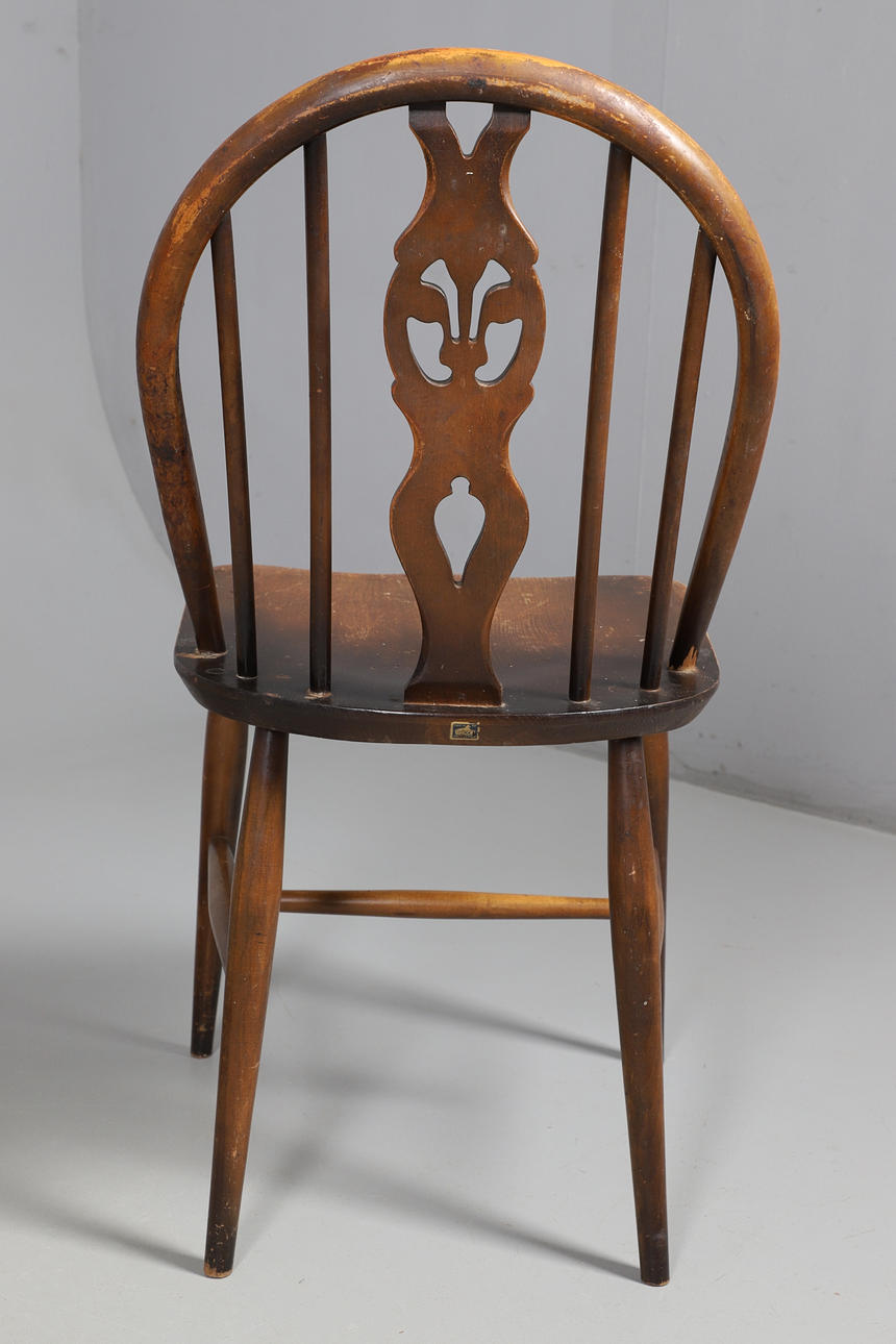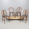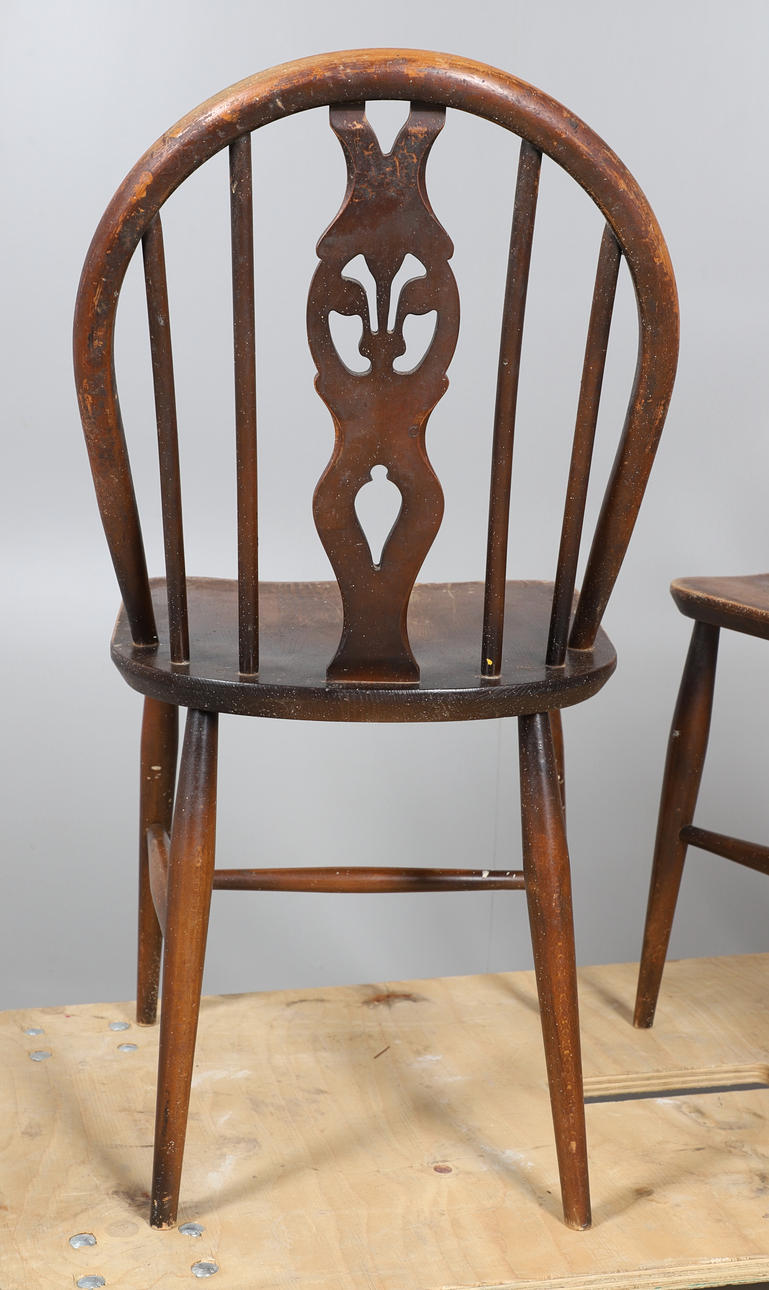 Stick back with shaped/pierced splat, the legs united by a H stretcher. Seat height 42cm, Total height 82cm. (4).
