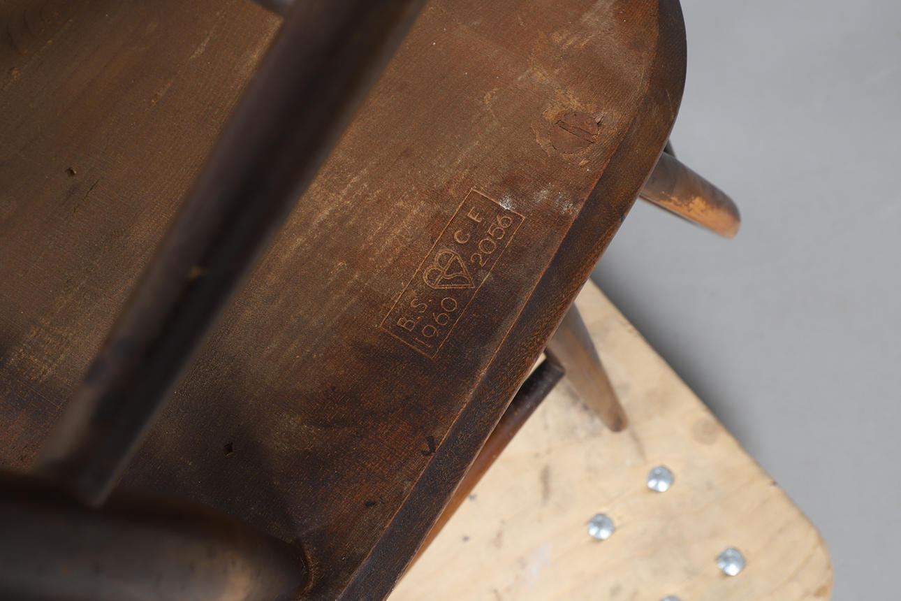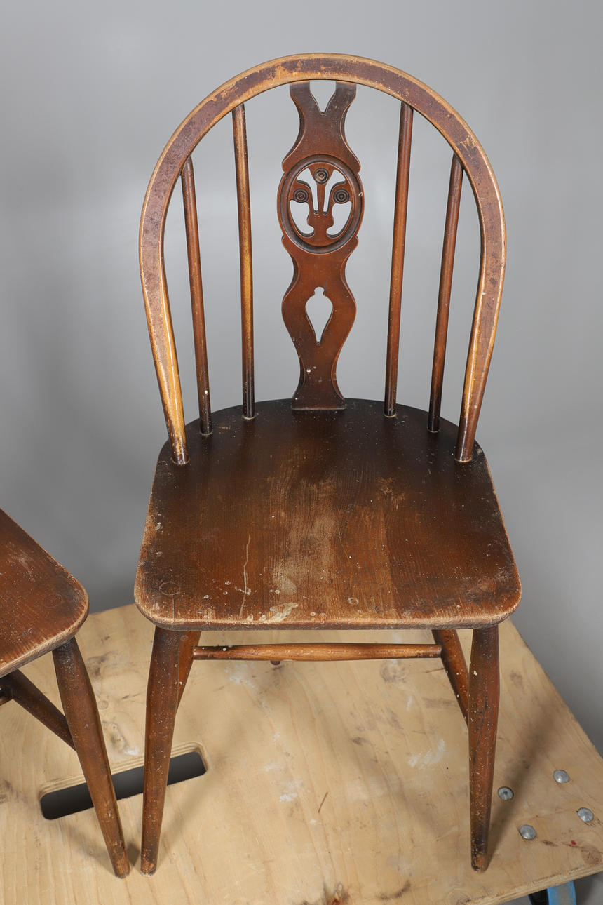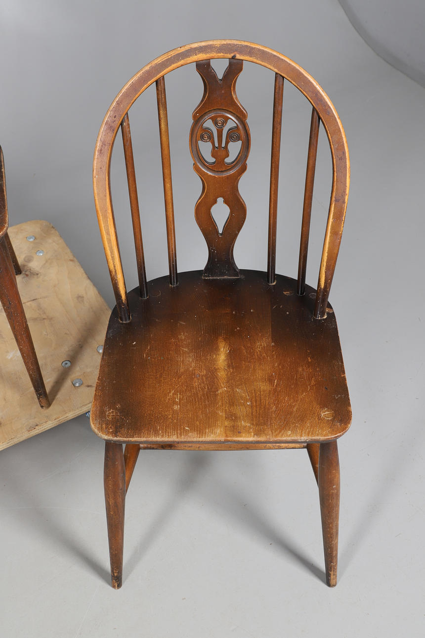 Stick back with shaped/pierced splat, the legs united by a H stretcher. Seat height 42cm, Total height 82cm. (4).