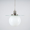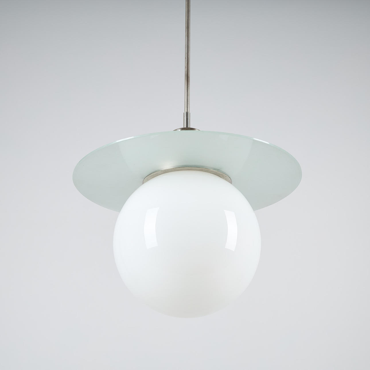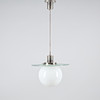 Nickel plated brass, opal glass and frosted clear glass. Height 90 cm, diameter 40 cm.